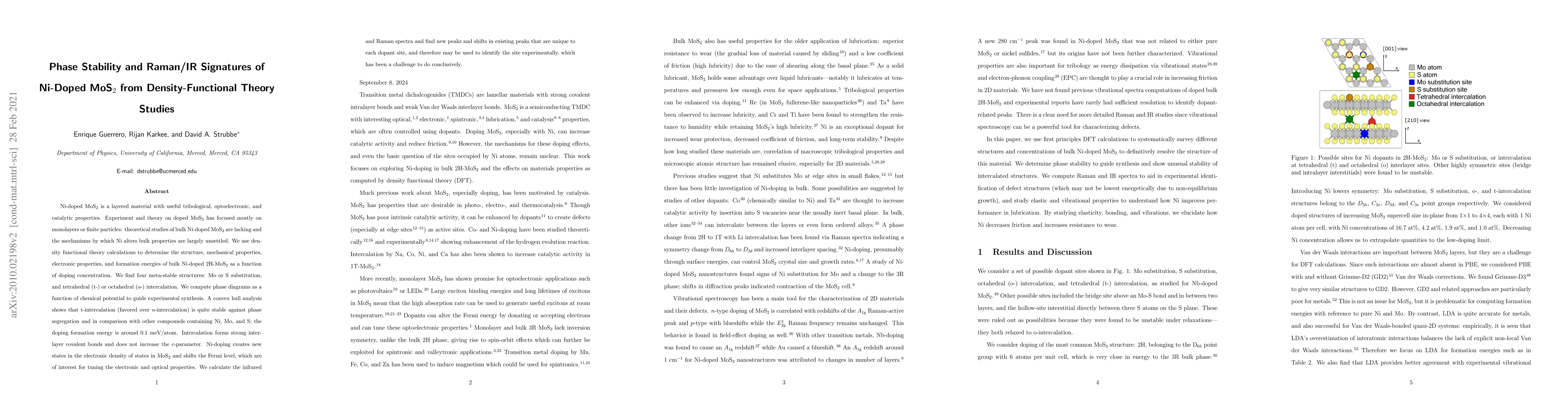This study uses density functional theory to investigate bulk Ni-doped MoS$_2$, identifying four meta-stable structures and showing tetrahedral intercalation is stable. The doping creates new electronic states and shifts the Fermi level, while new Raman and IR signatures enable dopant site identification.