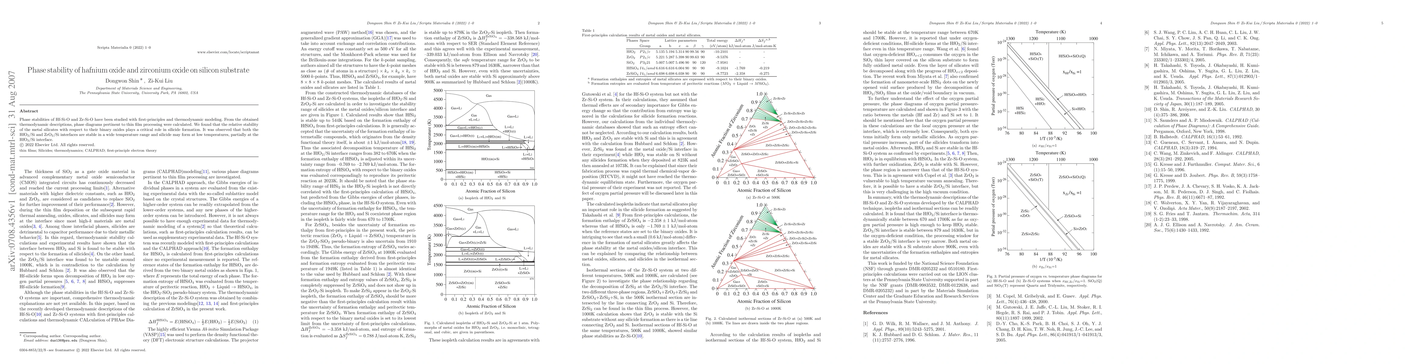 This research uses first-principles and thermodynamic modeling to analyze the phase stabilities of Hf-Si-O and Zr-Si-O systems. Key findings reveal that HfO2/Si and ZrO2/Si interfaces are stable across a wide temperature range, with potential for silicide formation at lower temperatures, particularly at HfO2/Si interfacing.