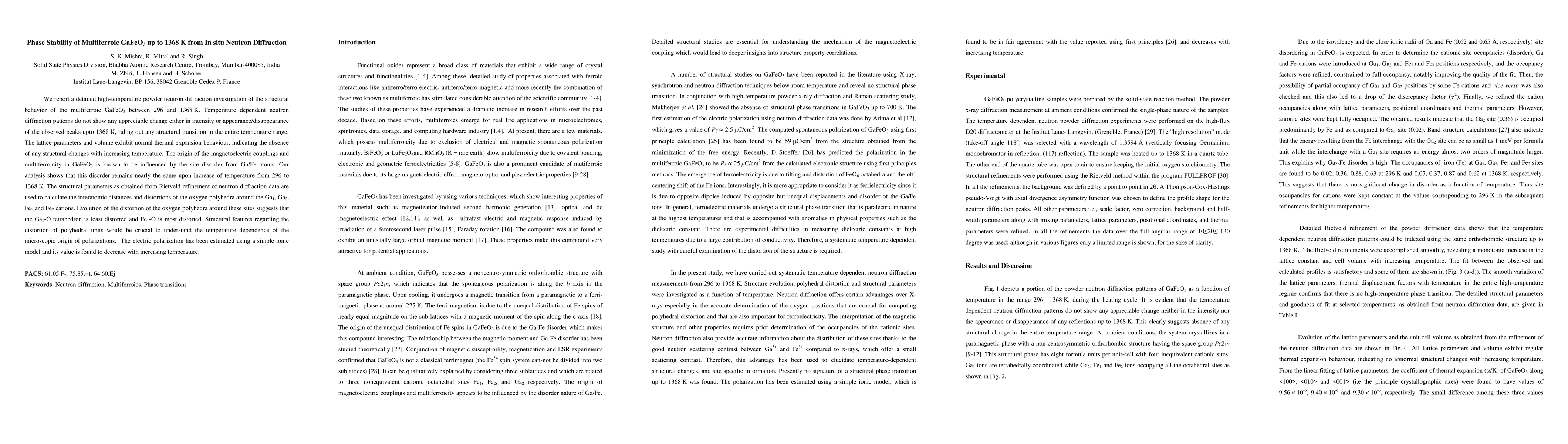 We report a detailed high-temperature powder neutron diffraction investigation of the structural behavior of the multiferroic GaFeO3 between 296 and 1368 K. Temperature dependent neutron diffraction patterns do not show any appreciable change either in intensity or appearance/disappearance of the observed peaks upto 1368 K, ruling out any structural transition in the entire temperature range. The lattice parameters and volume exhibit normal thermal expansion behaviour, indicating the absence of any structural changes with increasing temperature. The origin of the magnetoelectric couplings and multiferroicity in GaFeO3 is known to be influenced by the site disorder from Ga/Fe atoms. Our analysis shows that this disorder remains nearly the same upon increase of temperature from 296 to 1368 K. The structural parameters as obtained from Rietveld refinement of neutron diffraction data are used to calculate the interatomic distances and distortions of the oxygen polyhedra around the Ga1, Ga2, Fe1 and Fe2 cations. Evolution of the distortion of the oxygen polyhedra around these sites suggests that the Ga1-O tetrahedron is least distorted and Fe1-O is most distorted. Structural features regarding the distortion of polyhedral units would be crucial to understand the temperature dependence of the microscopic origin of polarizations. The electric polarization has been estimated using a simple ionic model and its value is found to decrease with increasing temperature.