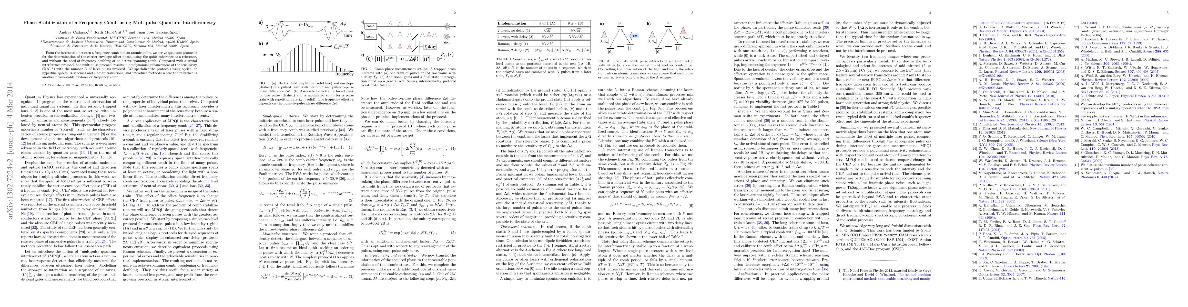 This paper proposes quantum protocols for stabilizing the phase of a frequency comb using multipulse quantum interferometry, achieving significant sensitivity enhancement without frequency doubling. The methods utilize qubit coherence and can be adapted for various qubit types and schemes.