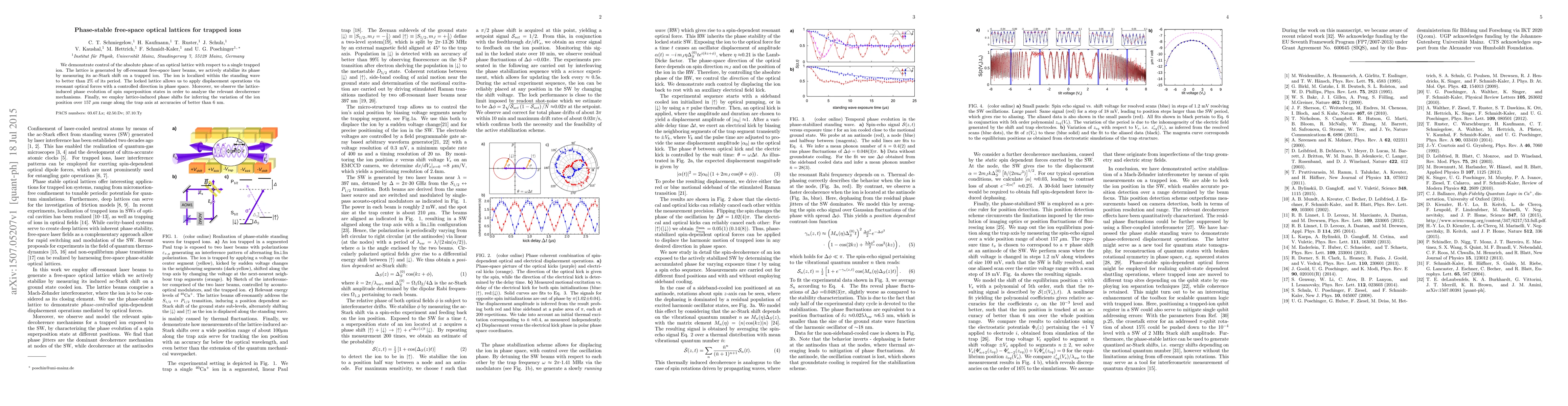 The research presents a method to control the phase of an optical lattice relative to a trapped ion using off-resonant laser beams. This phase-stable lattice enables precise displacement operations and analysis of spin superposition states' decoherence. The technique also allows for ion position sensing with high accuracy over a 157 $mu$m range along the trap axis, achieving sub-nanometer precision.