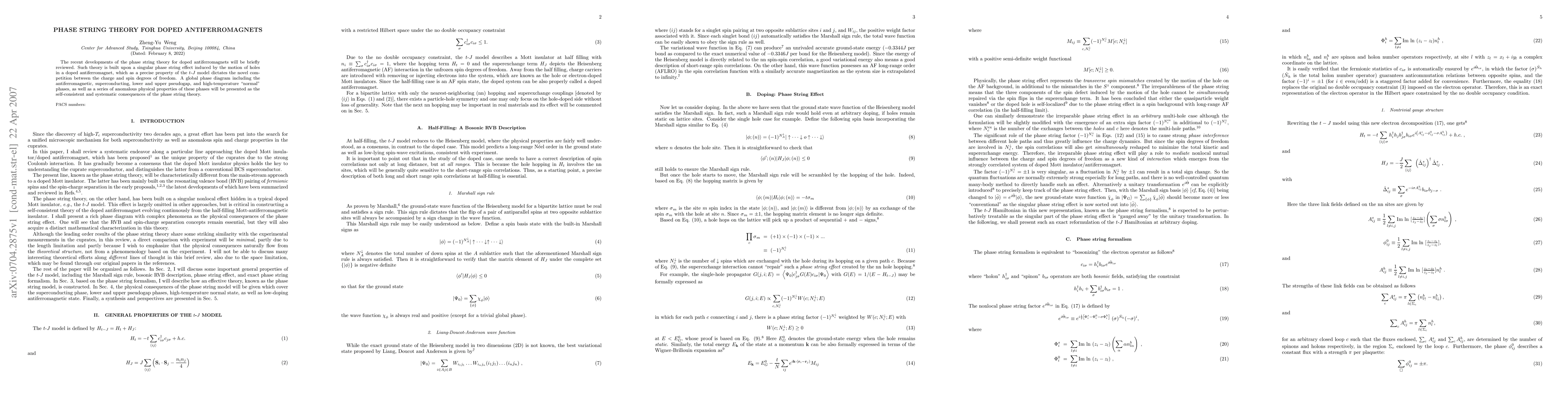 The paper reviews the phase string theory for doped antiferromagnets, focusing on the t-J model and its implications for charge and spin degrees of freedom.