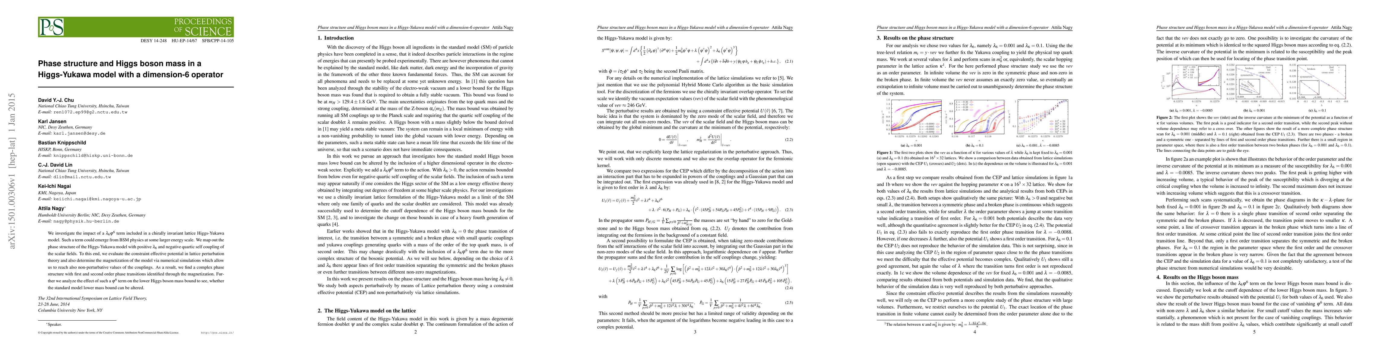 We investigate the impact of a $\lambda_6 \varphi^6$ term included in a chirally invariant lattice Higgs-Yukawa model. Such a term could emerge from BSM physics at some larger energy scale. We map out the phase structure of the Higgs-Yukawa model with positive $\lambda_6$ and negative quartic self coupling of the scalar fields. To this end, we evaluate the constraint effective potential in lattice perturbation theory and also determine the magnetization of the model via numerical simulations which allow us to reach also non-perturbative values of the couplings. As a result, we find a complex phase structure with first and second order phase transitions identified through the magnetization. Further we analyze the effect of such a $\varphi^6$ term on the lower Higgs boson mass bound to see, whether the standard model lower mass bound can be altered.