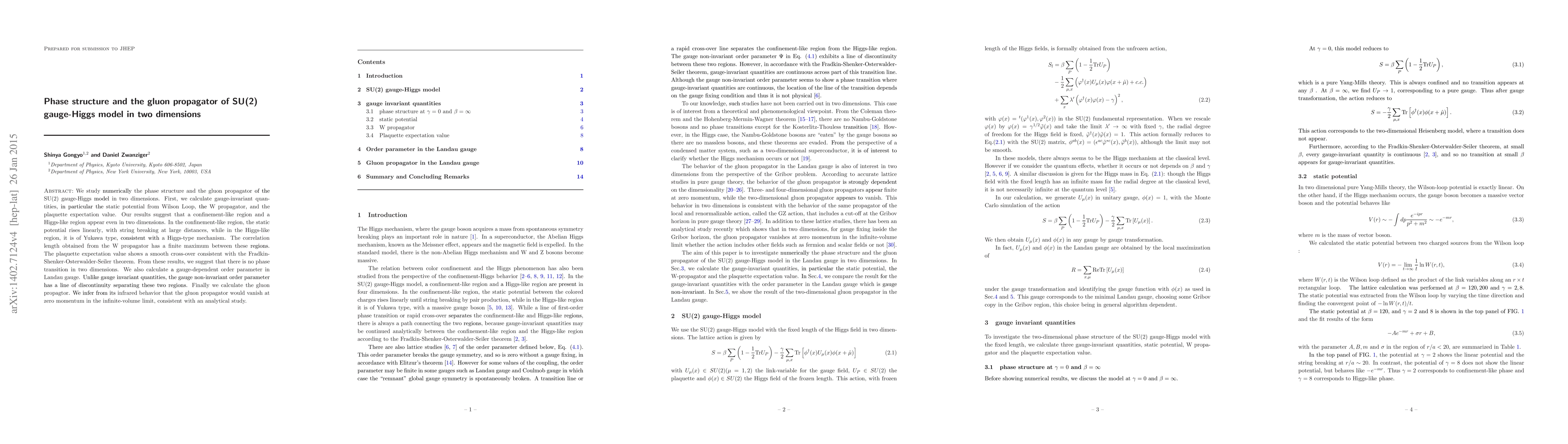 We study numerically the phase structure and the gluon propagator of the SU(2) gauge-Higgs model in two dimensions. First, we calculate gauge-invariant quantities, in particular the static potential from Wilson Loop, the W propagator, and the plaquette expectation value. Our results suggest that a confinement-like region and a Higgs-like region appear even in two dimensions. In the confinement-like region, the static potential rises linearly, with string breaking at large distances, while in the Higgs-like region, it is of Yukawa type, consistent with a Higgs-type mechanism. The correlation length obtained from the W propagator has a finite maximum between these regions. The plaquette expectation value shows a smooth cross-over consistent with the Fradkin-Shenker-Osterwalder-Seiler theorem. From these results, we suggest that there is no phase transition in two dimensions. We also calculate a gauge-dependent order parameter in Landau gauge. Unlike gauge invariant quantities, the gauge non-invariant order parameter has a line of discontinuity separating these two regions. Finally we calculate the gluon propagtor. We infer from its infrared behavior that the gluon propagator would vanish at zero momentum in the infinite-volume limit, consistent with an analytical study.
