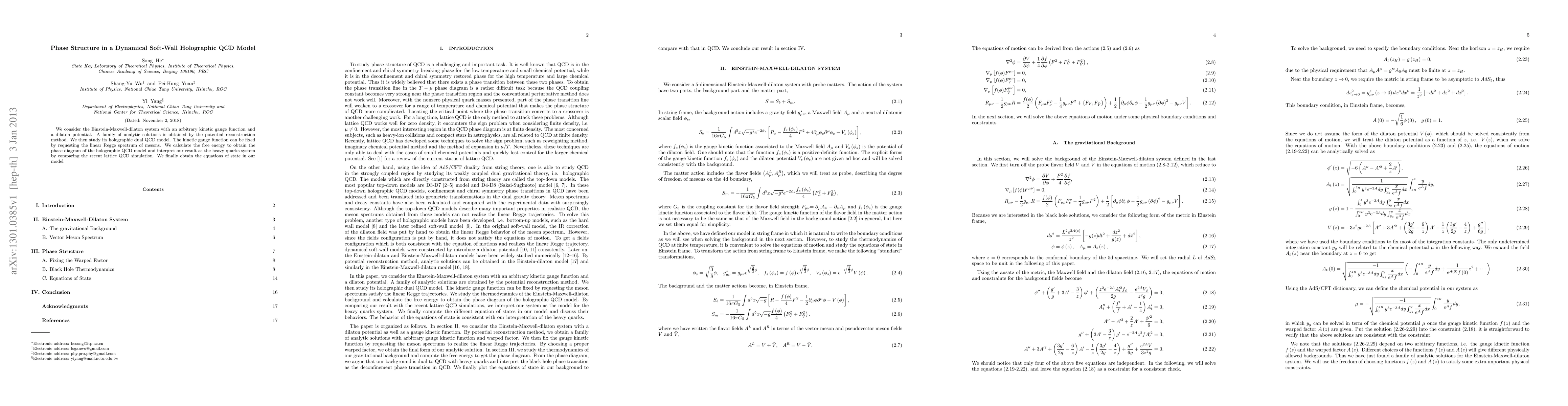 We consider the Einstein-Maxwell-dilaton system with an arbitrary kinetic gauge function and a dilaton potential. A family of analytic solutions is obtained by the potential reconstruction method. We then study its holographic dual QCD model. The kinetic gauge function can be fixed by requesting the linear Regge spectrum of mesons. We calculate the free energy to obtain the phase diagram of the holographic QCD model and interpret our result as the heavy quarks system by comparing the recent lattice QCD simulation. We finally obtain the equations of state in our model.