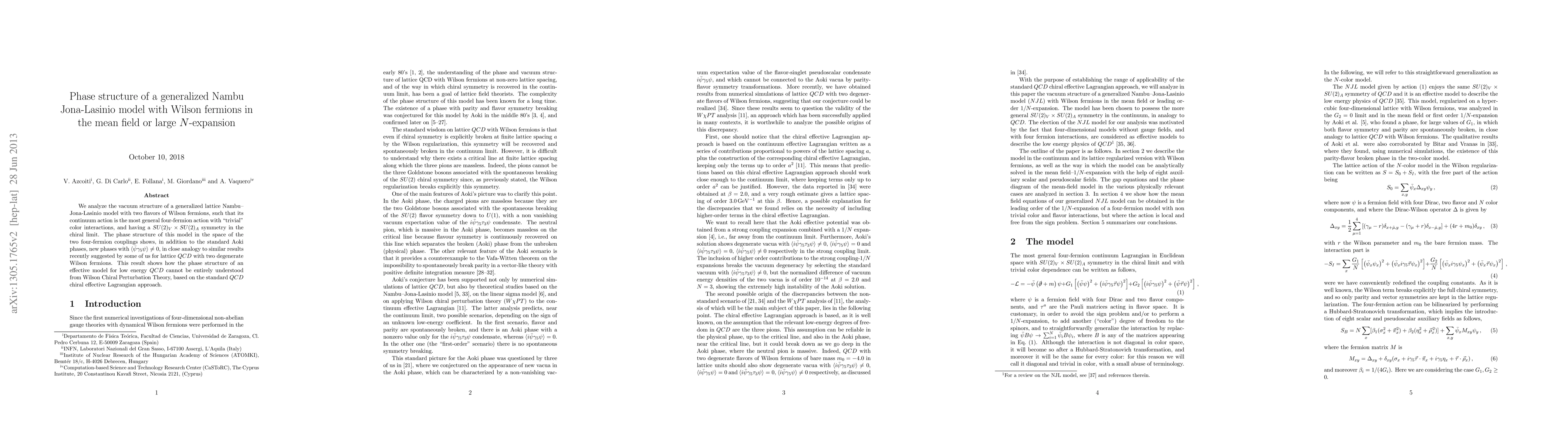 We analyze the vacuum structure of a generalized lattice Nambu--Jona-Lasinio model with two flavors of Wilson fermions, such that its continuum action is the most general four-fermion action with 'trivial' color interactions, and having a $SU(2)_V x SU(2)_A$ symmetry in the chiral limit. The phase structure of this model in the space of the two four-fermion couplings shows, in addition to the standard Aoki phases, new phases with $<\bar\psi \gamma_5\psi> != 0$, in close analogy to similar results recently suggested by some of us for lattice QCD with two degenerate Wilson fermions. This result shows how the phase structure of an effective model for low energy QCD cannot be entirely understood from Wilson Chiral Perturbation Theory, based on the standard QCD chiral effective Lagrangian approach.