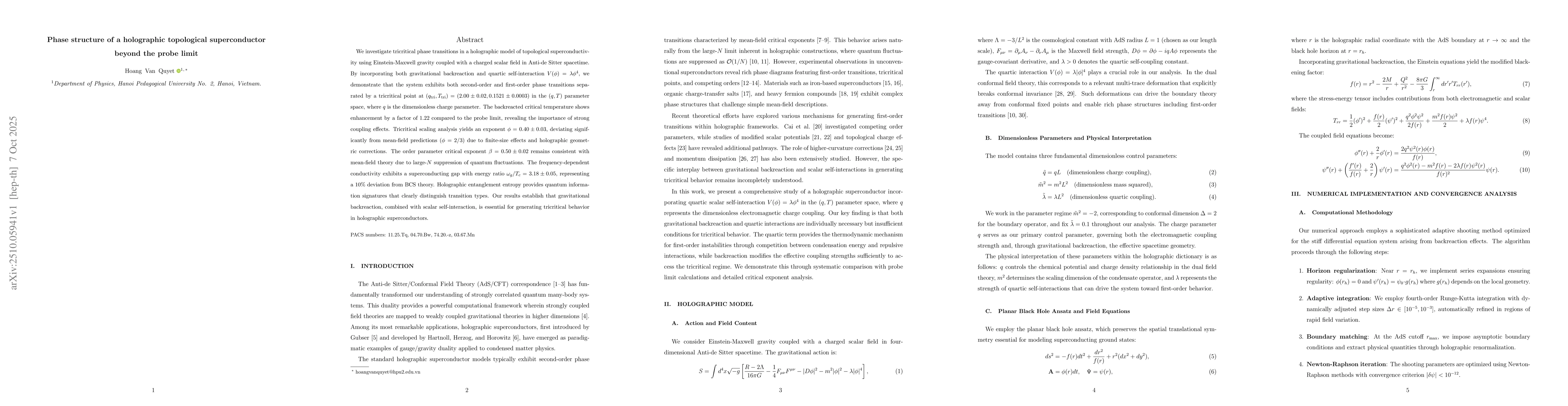We investigate tricritical phase transitions in a holographic model of topological superconductivity using Einstein-Maxwell gravity coupled with a charged scalar field in Anti-de Sitter spacetime. By incorporating both gravitational backreaction and quartic self-interaction $V(\phi) = \lambda \phi^4$, we demonstrate that the system exhibits both second-order and first-order phase transitions separated by a tricritical point at $(q_{\mathrm{tri}},T_{\mathrm{tri}})=(2.00\pm0.02,0.1521\pm0.0003)$ in the $(q,T)$ parameter space, where $q$ is the dimensionless charge parameter. The backreacted critical temperature shows enhancement by a factor of 1.22 compared to the probe limit, revealing the importance of strong coupling effects. Tricritical scaling analysis yields an exponent $\phi=0.40\pm0.03$, deviating significantly from mean-field predictions ($\phi=2/3$) due to finite-size effects and holographic geometric corrections. The order parameter critical exponent $\beta=0.50\pm0.02$ remains consistent with mean-field theory due to large-$N$ suppression of quantum fluctuations. The frequency-dependent conductivity exhibits a superconducting gap with energy ratio $\omega_{g}/T_{c}=3.18\pm0.05$, representing a $10\%$ deviation from BCS theory. Holographic entanglement entropy provides quantum information signatures that clearly distinguish transition types. Our results establish that gravitational backreaction, combined with scalar self-interaction, is essential for generating tricritical behavior in holographic superconductors.
