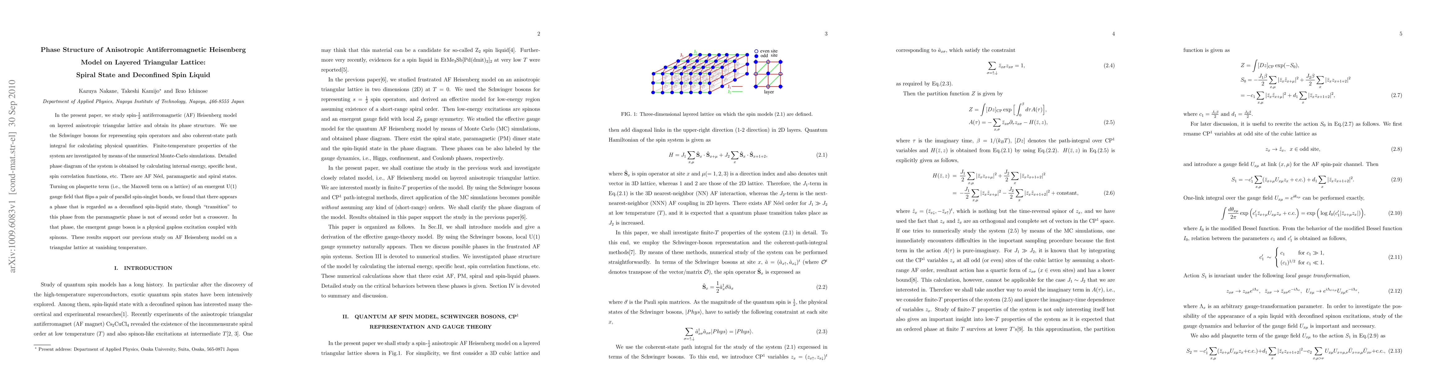 This paper investigates the phase structure of an anisotropic antiferromagnetic Heisenberg model on a layered triangular lattice, revealing a phase diagram with Néel, paramagnetic, and spiral states. The study introduces a plaquette term leading to a deconfined spin-liquid phase, characterized by a gapless gauge boson coupled with spinons, identified via Schwinger bosons, coherent-state path integrals, and Monte-Carlo simulations.