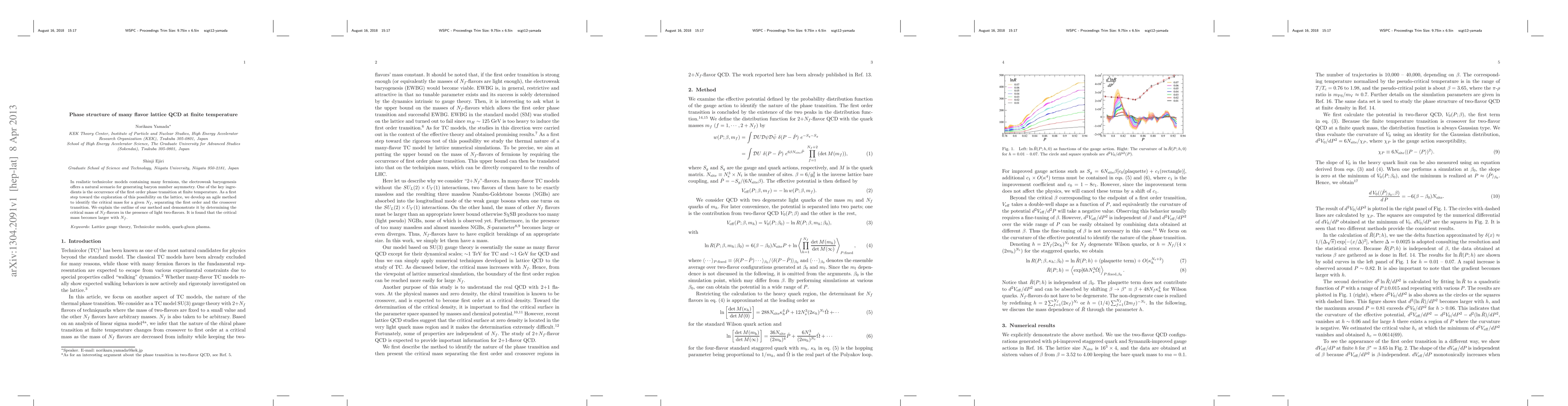In realistic technicolor models containing many fermions, the electroweak baryogenesis offers a natural scenario for generating baryon number asymmetry. One of the key ingredients is the occurrence of the first order phase transition at finite temperature. As a first step toward the exploration of this possibility on the lattice, we develop an agile method to identify the critical mass for a given Nf, separating the first order and the crossover transition. We explain the outline of our method and demonstrate it by determining the critical mass of Nf-flavors in the presence of light two-flavors. It is found that the critical mass becomes larger with Nf.
