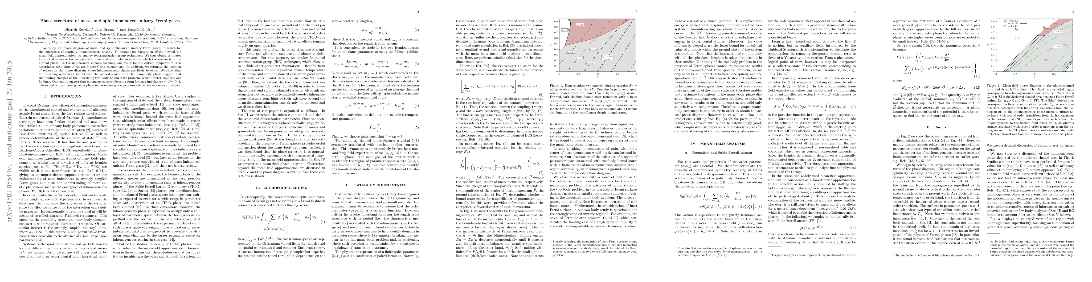 This paper investigates the phase structure of mass- and spin-imbalanced unitary Fermi gases, identifying regions where inhomogeneous phases emerge using renormalization group techniques. It finds that inhomogeneous condensates form at mass ratios greater than three and their extent grows with increased mass imbalance, aligning with Monte Carlo calculations for the critical temperature.