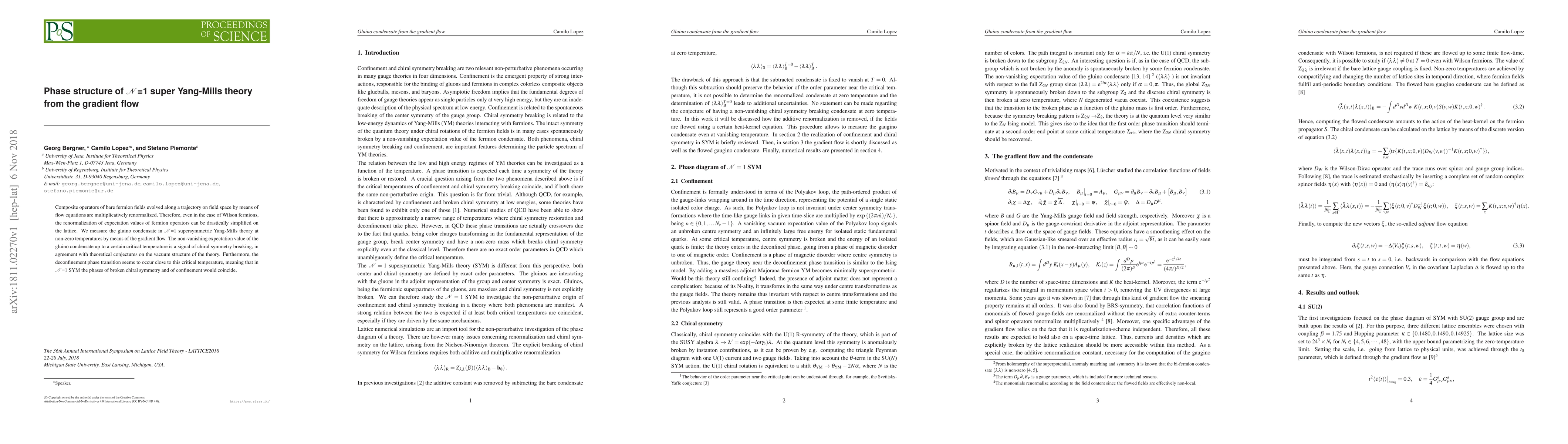 Composite operators of bare fermion fields evolved along a trajectory on field space by means of flow equations are multiplicatively renormalized. Therefore, even in the case of Wilson fermions, the renormalization of expectation values of fermion operators can be drastically simplified on the lattice. We measure the gluino condensate in $\mathcal{N}$=1 supersymmetric Yang-Mills theory at non-zero temperatures by means of the gradient flow. The non-vanishing expectation value of the gluino condensate up to a certain critical temperature is a signal of chiral symmetry breaking, in agreement with theoretical conjectures on the vacuum structure of the theory. Furthermore, the deconfinement phase transition seems to occur close to this critical temperature, meaning that in $\mathcal{N}$=1 SYM the phases of broken chiral symmetry and of confinement would coincide.