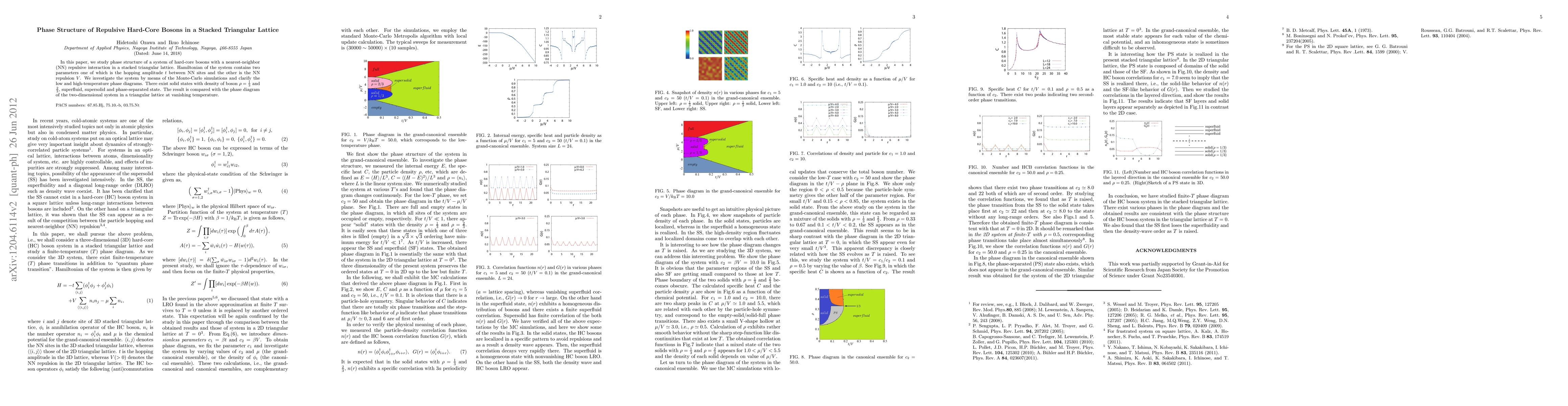 This paper investigates the phase structure of hard-core bosons in a stacked triangular lattice with nearest-neighbor repulsive interactions, using Monte-Carlo simulations to map out low and high-temperature phase diagrams. The findings reveal solid states at densities of $\rho={1 \over 3}$ and ${2\over 3}$, superfluid, supersolid, and phase-separated states.