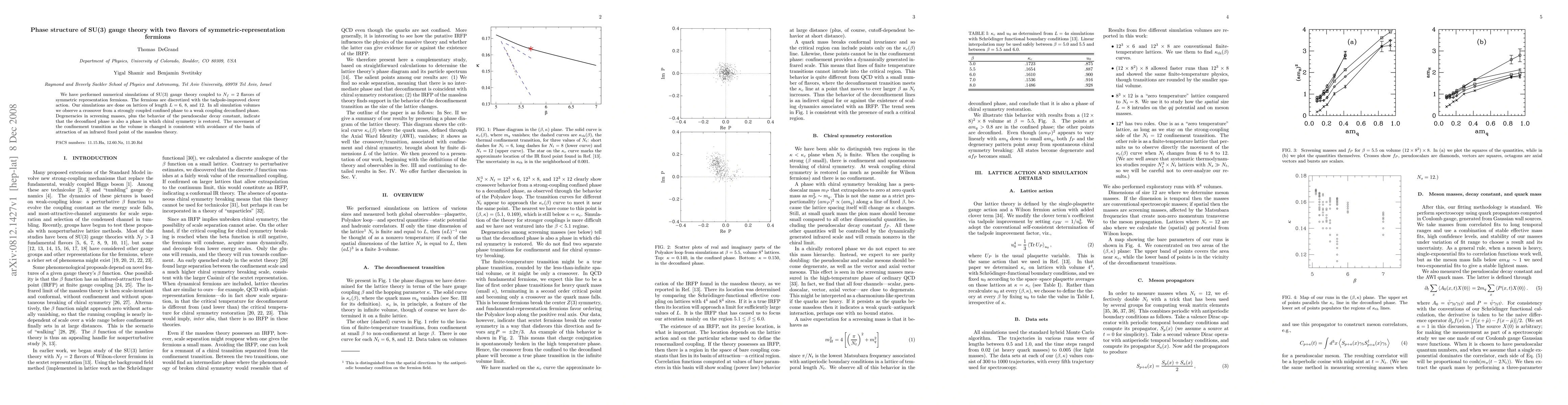 We have performed numerical simulations of SU(3) gauge theory coupled to Nf=2 flavors of symmetric representation fermions. The fermions are discretized with the tadpole-improved clover action. Our simulations are done on lattices of length L=6, 8, and 12. In all simulation volumes we observe a crossover from a strongly coupled confined phase to a weak coupling deconfined phase. Degeneracies in screening masses, plus the behavior of the pseudoscalar decay constant, indicate that the deconfined phase is also a phase in which chiral symmetry is restored. The movement of the confinement transition as the volume is changed is consistent with avoidance of the basin of attraction of an infrared fixed point of the massless theory.