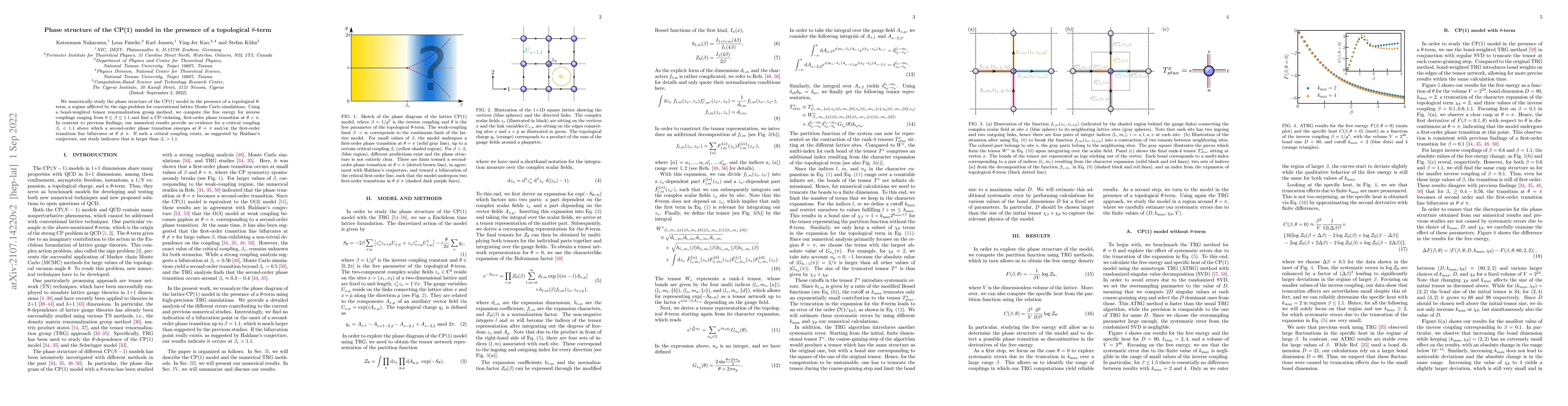This paper uses a bond-weighted tensor renormalization group method to study the CP(1) model with a topological $\theta$-term, finding a CP-violating first-order phase transition at $\theta=\pi$ without evidence of a second-order transition or bifurcation, suggesting any critical coupling $\beta_c$ is greater than 1.1.