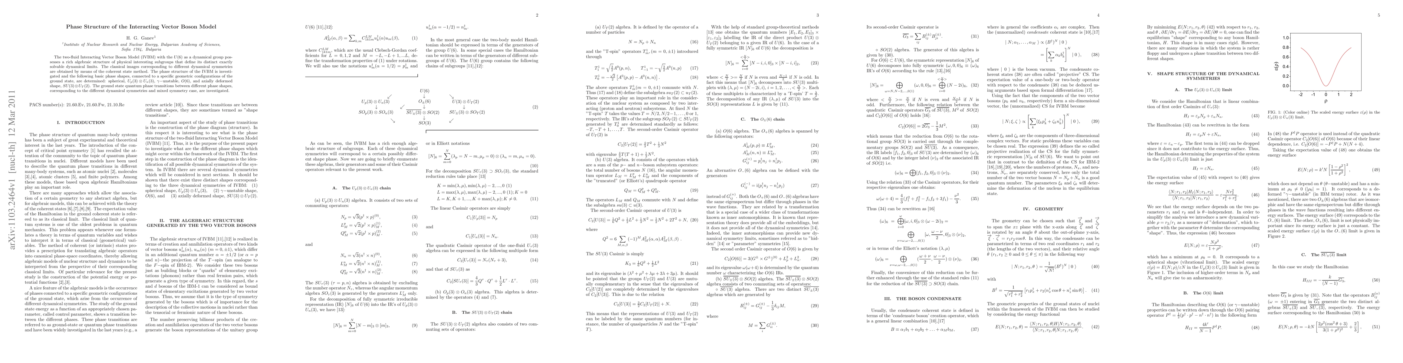 The Interacting Vector Boson Model (IVBM) with U(6) symmetry exhibits distinct phase shapes, including spherical, O(6), and axially deformed configurations, with quantum phase transitions between them. The study employs coherent state methods to explore these phases and their dynamical symmetries.