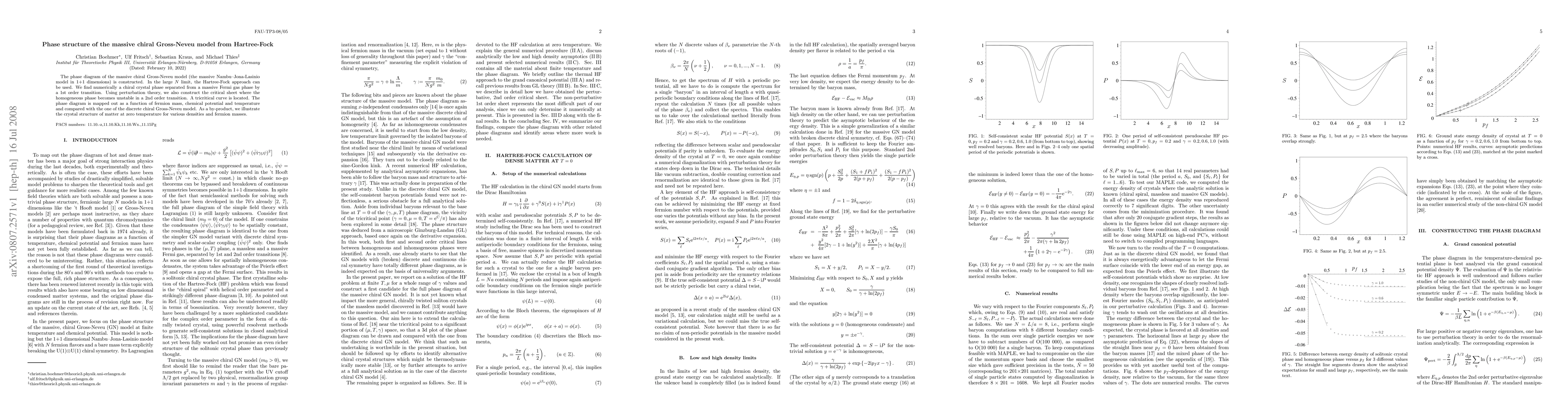 This paper constructs the phase diagram of the massive chiral Gross-Neveu model using the Hartree-Fock approach, identifying a chiral crystal phase and a massive Fermi gas phase separated by a first-order transition. It also locates a critical sheet for a second-order transition and a tricritical curve, mapping the phase diagram as a function of fermion mass, chemical potential, and temperature.