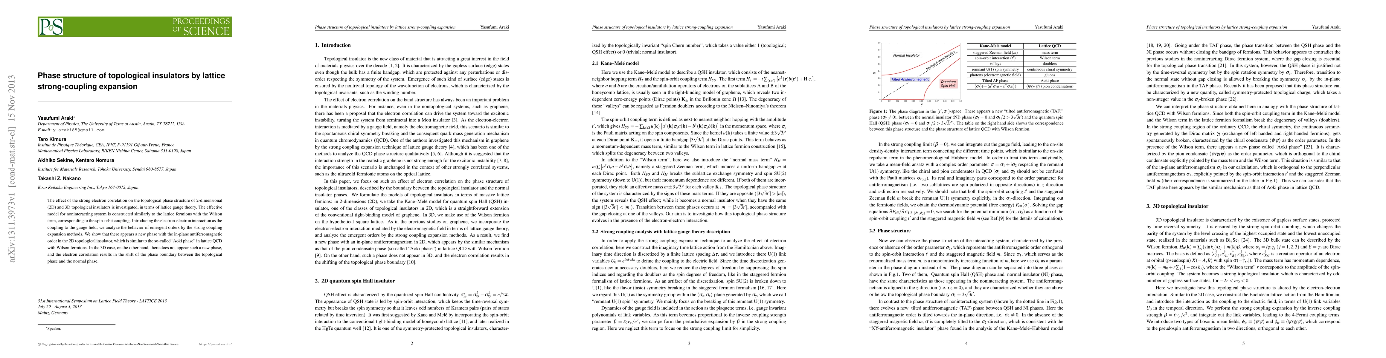 The effect of the strong electron correlation on the topological phase structure of 2-dimensional (2D) and 3D topological insulators is investigated, in terms of lattice gauge theory. The effective model for noninteracting system is constructed similarly to the lattice fermions with the Wilson term, corresponding to the spin-orbit coupling. Introducing the electron-electron interaction as the coupling to the gauge field, we analyze the behavior of emergent orders by the strong coupling expansion methods. We show that there appears a new phase with the in-plane antiferromagnetic order in the 2D topological insulator, which is similar to the so-called "Aoki phase" in lattice QCD with Wilson fermions. In the 3D case, on the other hand, there does not appear such a new phase, and the electron correlation results in the shift of the phase boundary between the topological phase and the normal phase.