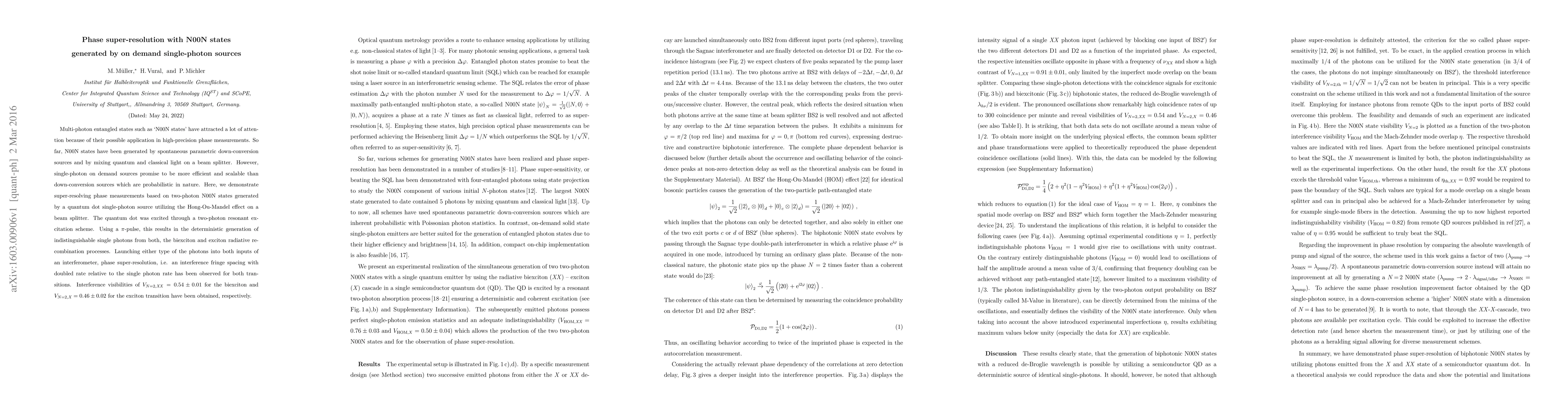 This paper demonstrates phase super-resolution using two-photon N00N states generated by a quantum dot single-photon source, achieving interference fringe spacing with a doubled rate relative to the single photon rate. The study utilizes the Hong-Ou-Mandel effect and $\pi$-pulse excitation, achieving high interference visibilities for biexciton and exciton transitions.