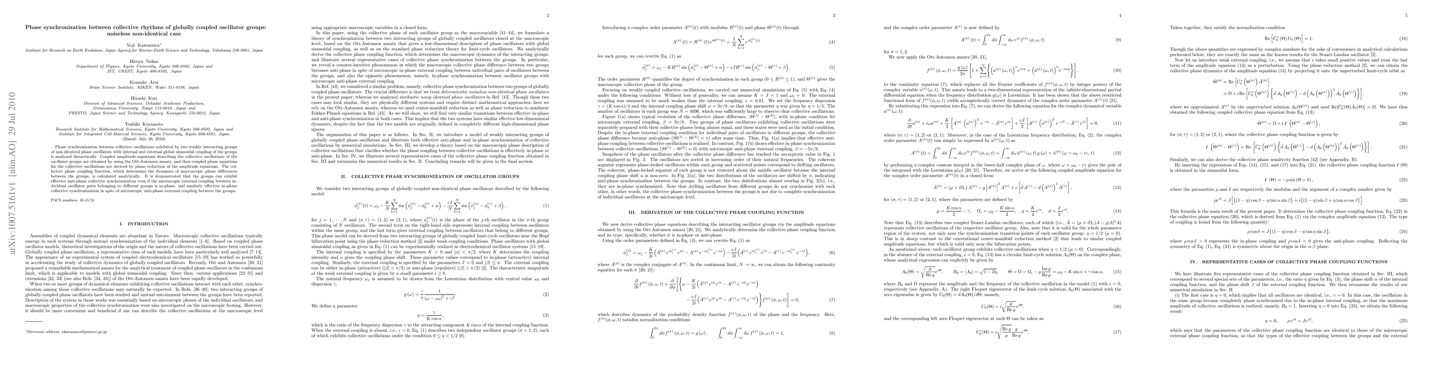 This paper theoretically analyzes phase synchronization between two weakly interacting groups of non-identical phase oscillators under global sinusoidal coupling. It derives coupled phase equations using the Ott-Antonsen ansatz and demonstrates that the groups can achieve effective anti-phase or in-phase synchronization despite microscopic coupling differences.