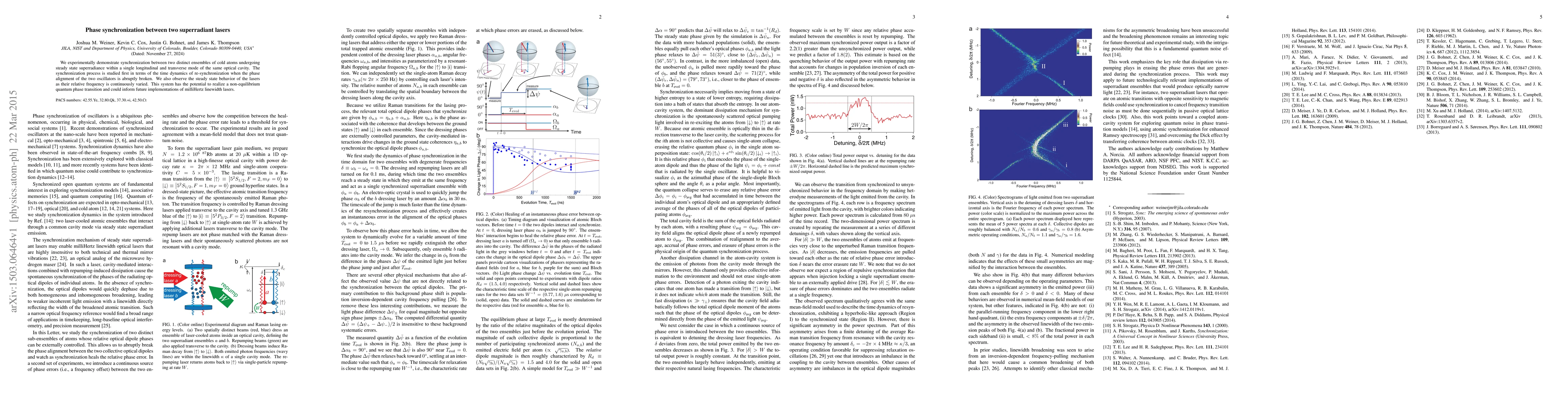 This paper demonstrates synchronization between two superradiant lasers using cold atom ensembles within a shared optical cavity, studying both time dynamics of re-synchronization and steady-state behavior under varying relative frequencies. The findings may enable non-equilibrium quantum phase transitions and support the development of lasers with milliHertz linewidths.
