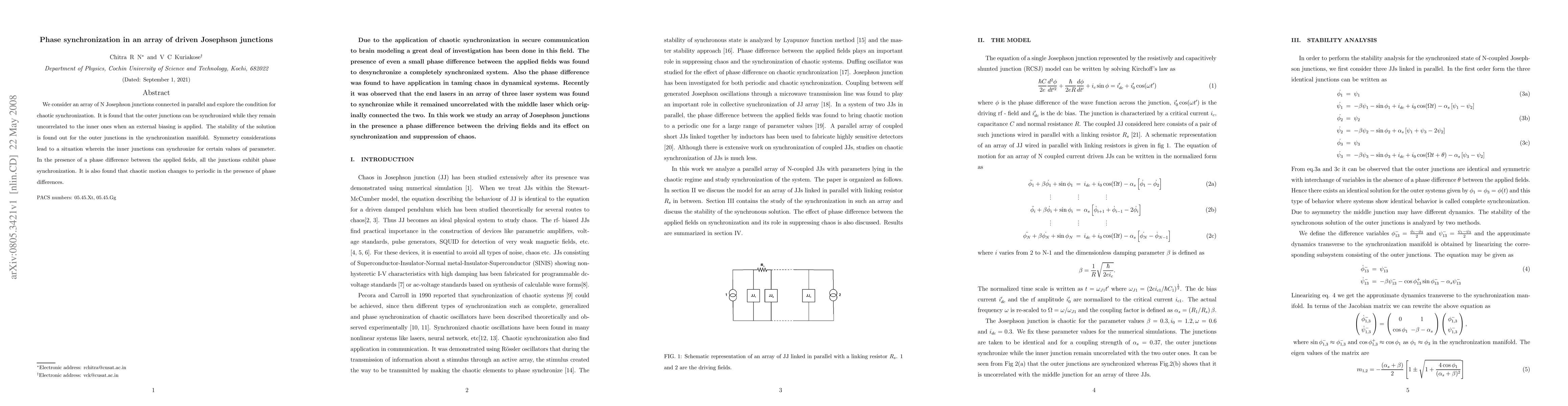 We consider an array of N Josephson junctions connected in parallel and explore the condition for chaotic synchronization. It is found that the outer junctions can be synchronized while they remain uncorrelated to the inner ones when an external biasing is applied. The stability of the solution is found out for the outer junctions in the synchronization manifold. Symmetry considerations lead to a situation wherein the inner junctions can synchronize for certain values of parameter. In the presence of a phase difference between the applied fields, all the junctions exhibit phase synchronization. It is also found that chaotic motion changes to periodic in the presence of phase differences.