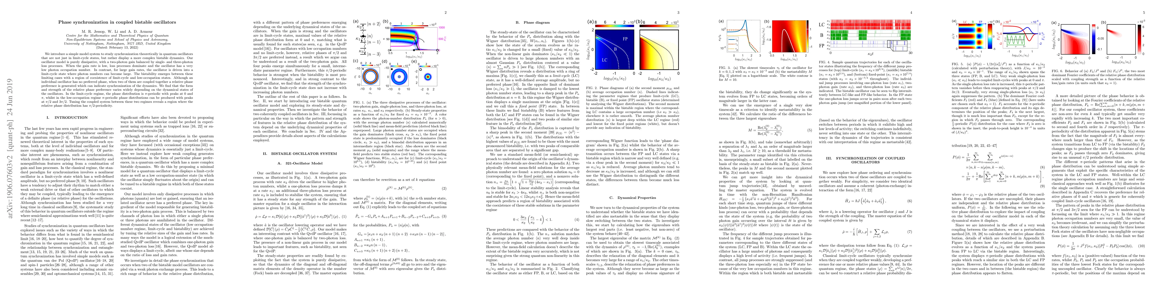 Researchers study synchronization in coupled quantum oscillators with bistable dynamics, finding a region where phase preference varies widely depending on the oscillator's state, and reveals new insights into phase synchronization.