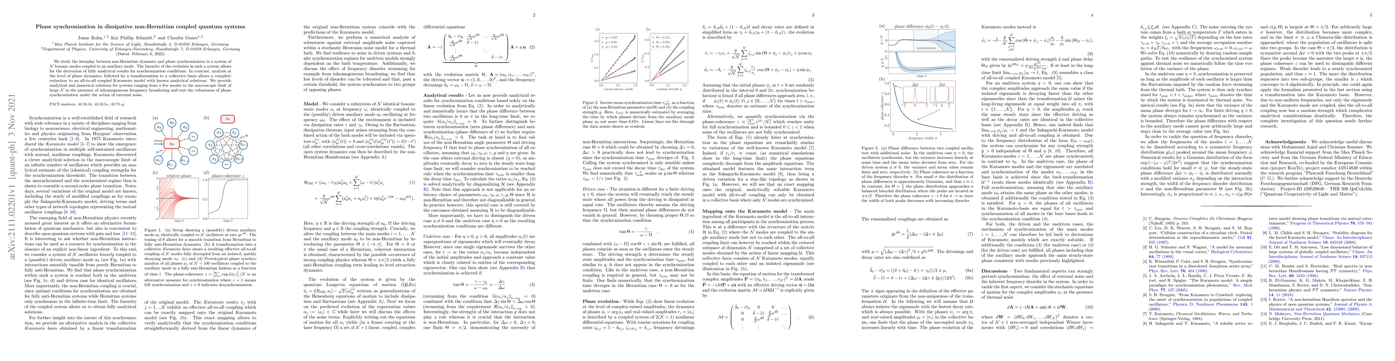 We study the interplay between non-Hermitian dynamics and phase synchronization in a system of $\mathcal{N}$ bosonic modes coupled to an auxiliary mode. The linearity of the evolution in such a system allows for the derivation of fully analytical results for synchronization conditions. In contrast, analysis at the level of phase dynamics, followed by a transformation to a collective basis allows a complete reduction to an all-to-all coupled Kuramoto model with known analytical solutions. We provide analytical and numerical solutions for systems ranging from a few modes to the macroscopic limit of large $\mathcal{N}$ in the presence of inhomogeneous frequency broadening and test the robustness of phase synchronization under the action of external noise.