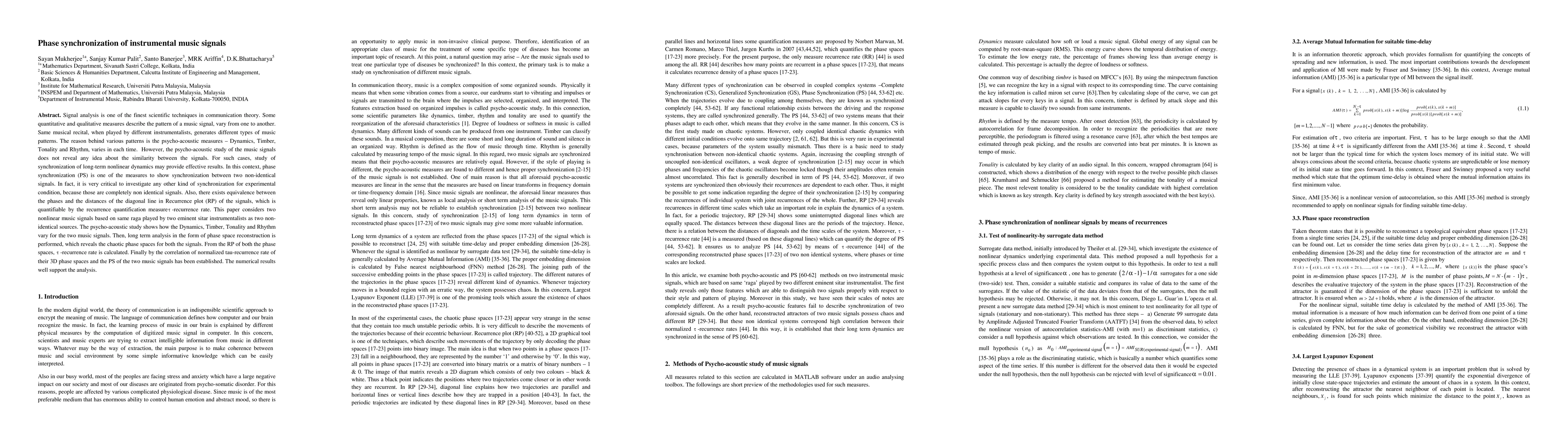 Signal analysis is one of the finest scientific techniques in communication theory. Some quantitative and qualitative measures describe the pattern of a music signal, vary from one to another. Same musical recital, when played by different instrumentalists, generates different types of music patterns. The reason behind various patterns is the psychoacoustic measures - Dynamics, Timber, Tonality and Rhythm, varies in each time. However, the psycho-acoustic study of the music signals does not reveal any idea about the similarity between the signals. For such cases, study of synchronization of long-term nonlinear dynamics may provide effective results. In this context, phase synchronization (PS) is one of the measures to show synchronization between two non-identical signals. In fact, it is very critical to investigate any other kind of synchronization for experimental condition, because those are completely non identical signals. Also, there exists equivalence between the phases and the distances of the diagonal line in Recurrence plot (RP) of the signals, which is quantifiable by the recurrence quantification measure tau-recurrence rate. This paper considers two nonlinear music signals based on same raga played by two eminent sitar instrumentalists as two non-identical sources. The psycho-acoustic study shows how the Dynamics, Timber, Tonality and Rhythm vary for the two music signals. Then, long term analysis in the form of phase space reconstruction is performed, which reveals the chaotic phase spaces for both the signals. From the RP of both the phase spaces, tau-recurrence rate is calculated. Finally by the correlation of normalized tau-recurrence rate of their 3D phase spaces and the PS of the two music signals has been established. The numerical results well support the analysis.