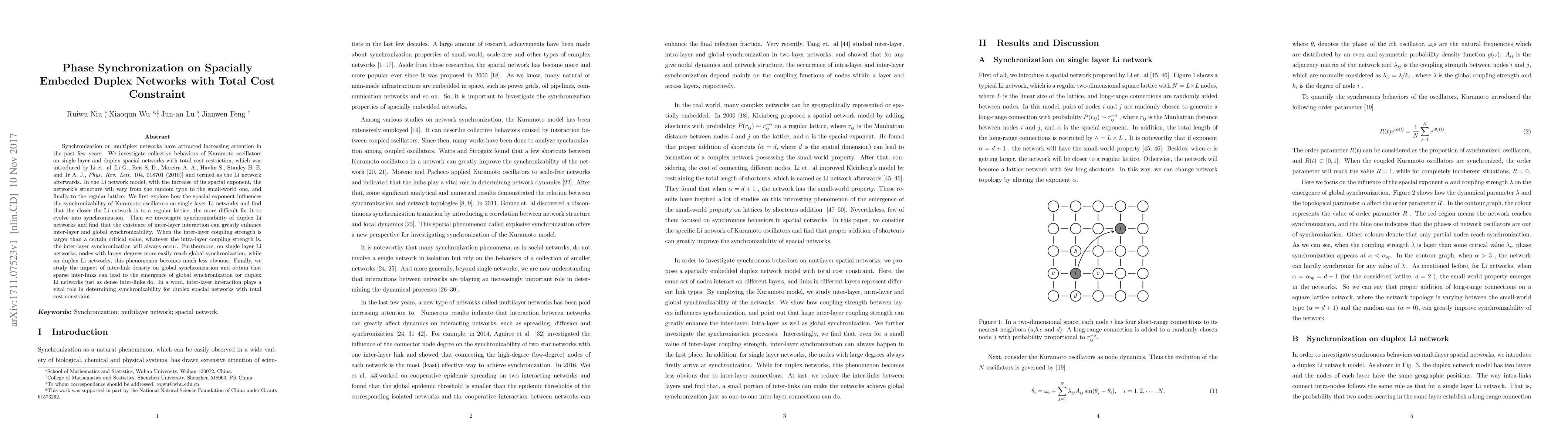 Synchronization on multiplex networks have attracted increasing attention in the past few years. We investigate collective behaviors of Kuramoto oscillators on single layer and duplex spacial networks with total cost restriction, which was introduced by Li et. al [Li G., Reis S. D., Moreira A. A., Havlin S., Stanley H. E. and Jr A. J., {\it Phys. Rev. Lett.} 104, 018701 (2010)] and termed as the Li network afterwards. In the Li network model, with the increase of its spacial exponent, the network's structure will vary from the random type to the small-world one, and finally to the regular lattice.We first explore how the spacial exponent influences the synchronizability of Kuramoto oscillators on single layer Li networks and find that the closer the Li network is to a regular lattice, the more difficult for it to evolve into synchronization. Then we investigate synchronizability of duplex Li networks and find that the existence of inter-layer interaction can greatly enhance inter-layer and global synchronizability. When the inter-layer coupling strength is larger than a certain critical value, whatever the intra-layer coupling strength is, the inter-layer synchronization will always occur. Furthermore, on single layer Li networks, nodes with larger degrees more easily reach global synchronization, while on duplex Li networks, this phenomenon becomes much less obvious. Finally, we study the impact of inter-link density on global synchronization and obtain that sparse inter-links can lead to the emergence of global synchronization for duplex Li networks just as dense inter-links do. In a word, inter-layer interaction plays a vital role in determining synchronizability for duplex spacial networks with total cost constraint.