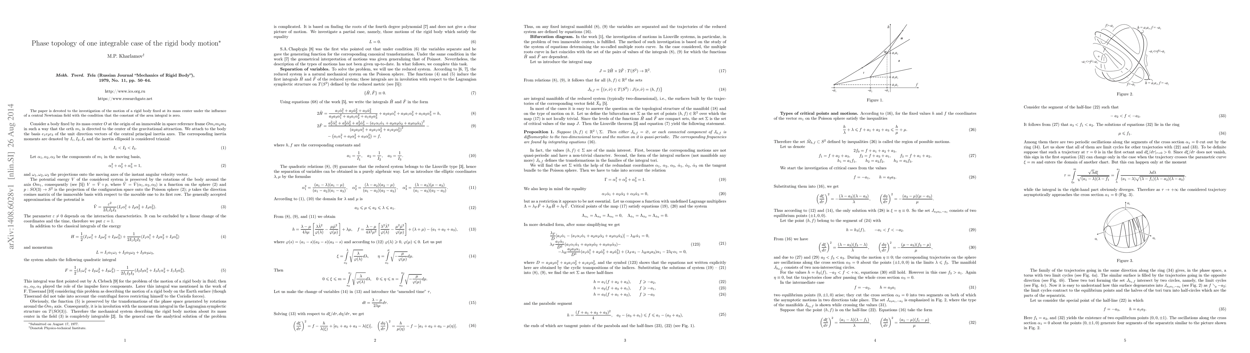This paper identifies the phase topology of a two-degree-freedom integrable rigid body motion system in a central Newtonian field, describing bifurcations of integral tori and singular surfaces. It details the first occurrence of bifurcation types $B$ and $C_2$, alongside the foliation of an invariant neighborhood of a saddle-type singularity.