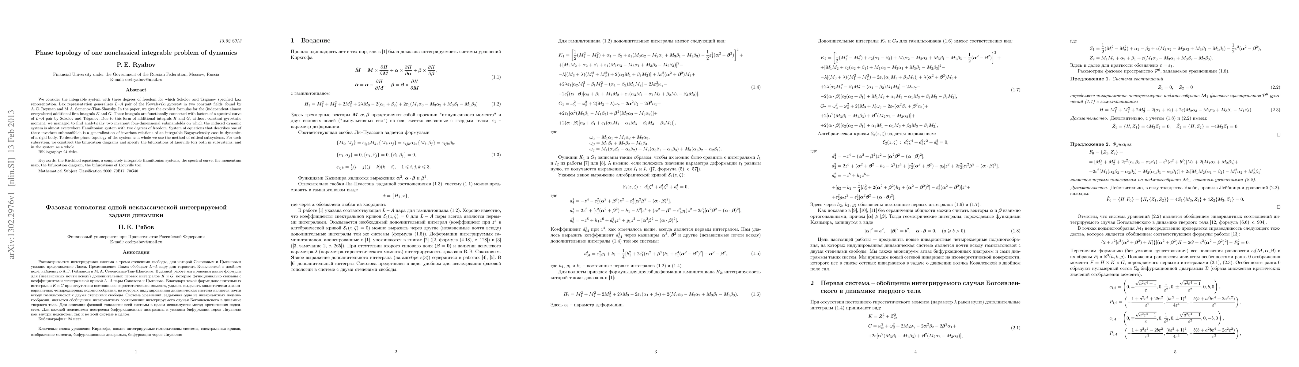 This paper presents explicit formulas for additional first integrals K and G in a three-degree-of-freedom integrable system, derived from a Lax representation. These integrals reveal two invariant four-dimensional submanifolds, enabling the description of the system as an almost everywhere Hamiltonian system with two degrees of freedom. The phase topology is analyzed using critical subsystems, with bifurcation diagrams constructed for each subsystem and the overall system, uncovering Liouville torus bifurcations.