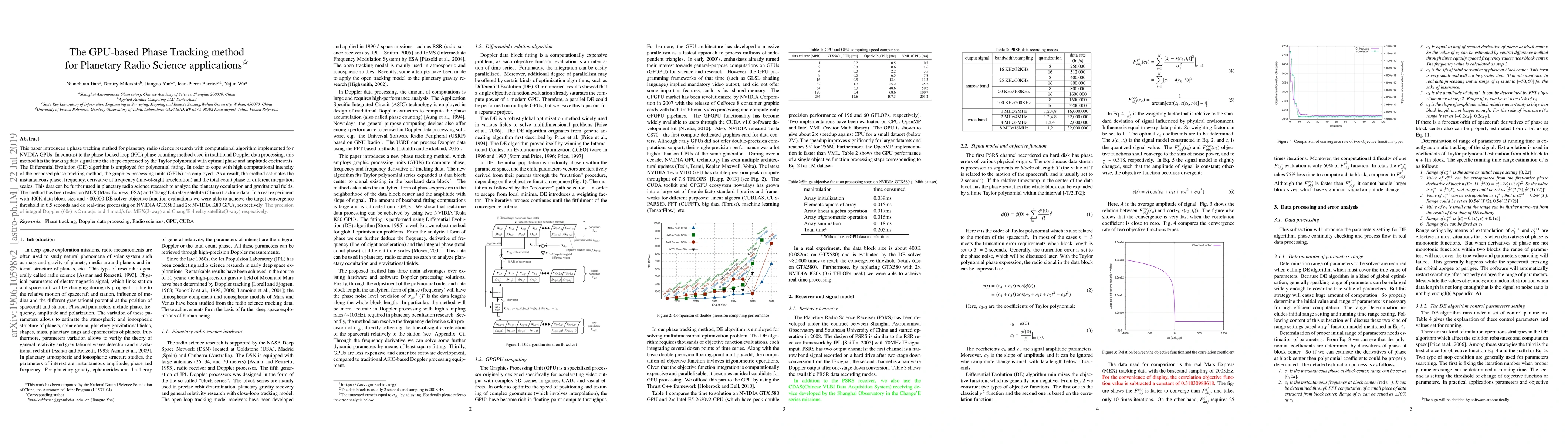 This paper introduces a phase tracking method for planetary radio science research with computational algorithm implemented fo r NVIDIA GPUs. In contrast to the phase-locked loop (PPL) phase counting method used in traditional Doppler data processing, this method fits the tracking data signal into the shape expressed by the Taylor polynomial with optimal phase and amplitude coefficients. The Differential Evolution (DE) algorithm is employed for polynomial fitting. In order to cope with high computational intensity of the proposed phase tracking method, the graphics processing units (GPUs) are employed. As a result, the method estimates the instantaneous phase, frequency, derivative of frequency (line-of-sight acceleration) and the total count phase of different integration scales. This data can be further used in planetary radio science research to analyze the planetary occultation and gravitational fields. The method has been tested on MEX (Mars Express, ESA) and Chang'E 4 relay satellite (China) tracking data. In a real experiment with 400K data block size and $\sim$80,000 DE solver objective function evaluations we were able to acheive the target convergence threshold in 6.5 seconds and do real-time processing on NVIDIA GTX580 and 2$\times$ NVIDIA K80 GPUs, respectively. The precision of integral Doppler (60s) is 2 mrad/s and 4 mrad/s for MEX(3-way) and Chang'E 4 relay satellite(3-way) respectively.