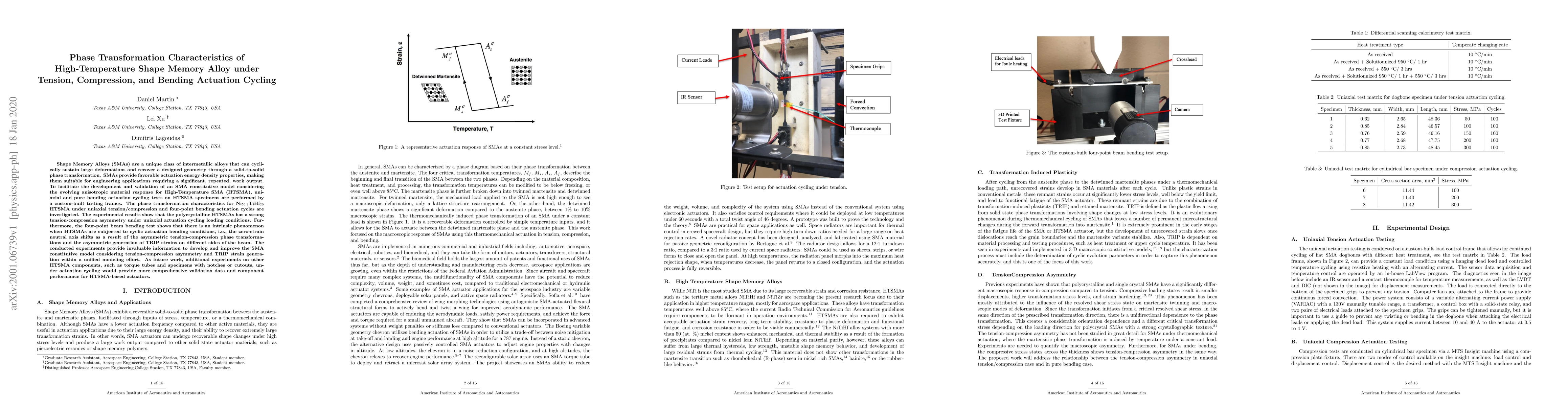 This paper investigates the phase transformation characteristics of high-temperature shape memory alloys (HTSMA) under various actuation cycling conditions, revealing strong tension-compression asymmetry and shifts in the neutral axis during bending. The findings are crucial for developing improved SMA constitutive models.