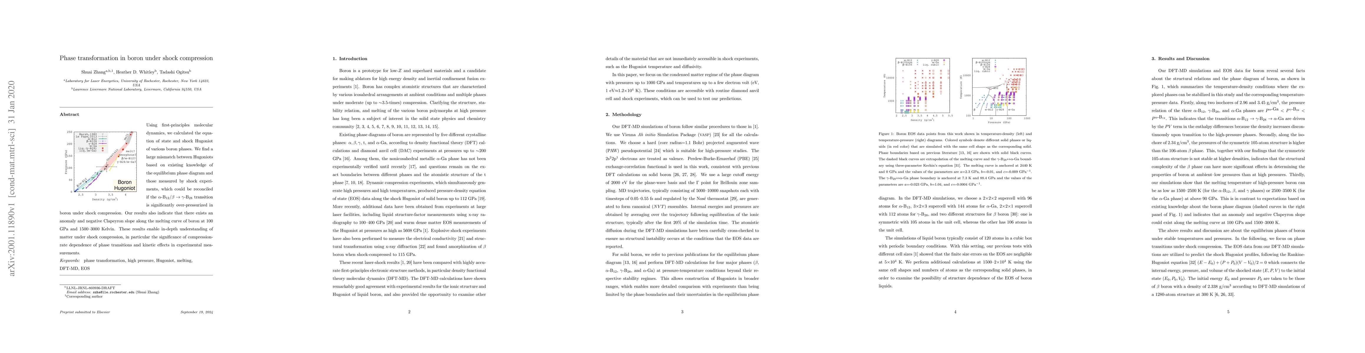 Researchers used first-principles molecular dynamics to study boron under shock compression, finding a discrepancy between predicted and experimental Hugoniots that could be explained by over-pressurization during the phase transition. The study also reveals an anomaly in the melting curve of boron at high pressures and temperatures.