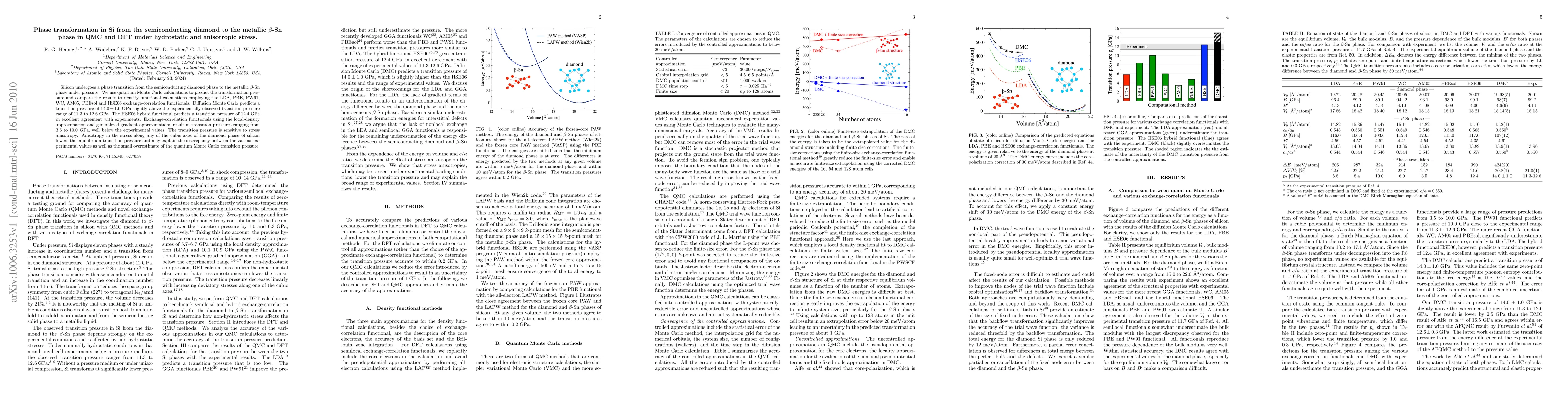 This study investigates the phase transformation of silicon from its semiconducting diamond to metallic beta-Sn phase under pressure using quantum Monte Carlo and density functional theory calculations. The HSE06 hybrid functional provides the most accurate transition pressure prediction, aligning closely with experimental data, while other DFT methods significantly underestimate the transition pressure.