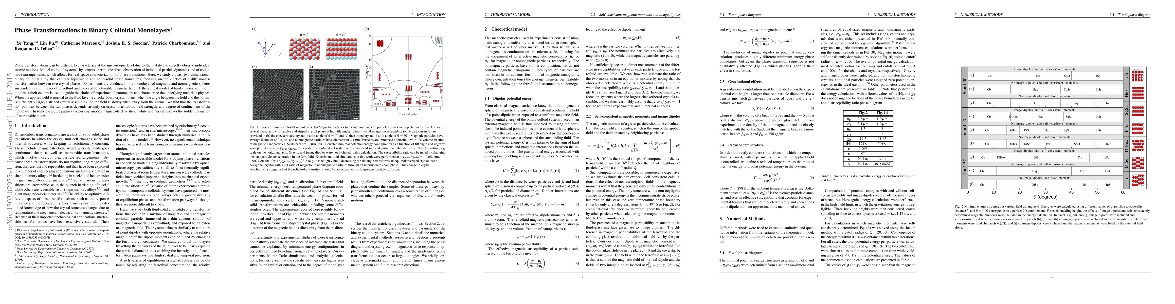 Phase transformations can be difficult to characterize at the microscopic level due to the inability to directly observe individual atomic motions. Model colloidal systems, by contrast, permit the direct observation of individual particle dynamics and of collective rearrangements, which allows for real-space characterization of phase transitions. Here, we study a quasi-two-dimensional, binary colloidal alloy that exhibits liquid-solid and solid-solid phase transitions, focusing on the kinetics of a diffusionless transformation between two crystal phases. Experiments are conducted on a monolayer of magnetic and nonmagnetic spheres suspended in a thin layer of ferrofluid and exposed to a tunable magnetic field. A theoretical model of hard spheres with point dipoles at their centers is used to guide the choice of experimental parameters and characterize the underlying materials physics. When the applied field is normal to the fluid layer, a checkerboard crystal forms; when the angle between the field and the normal is sufficiently large, a striped crystal assembles. As the field is slowly tilted away from the normal, we find that the transformation pathway between the two phases depends strongly on crystal orientation, field strength, and degree of confinement of the monolayer. In some cases, the pathway occurs by smooth magnetostrictive shear, while in others it involves the sudden formation of martensitic plates.