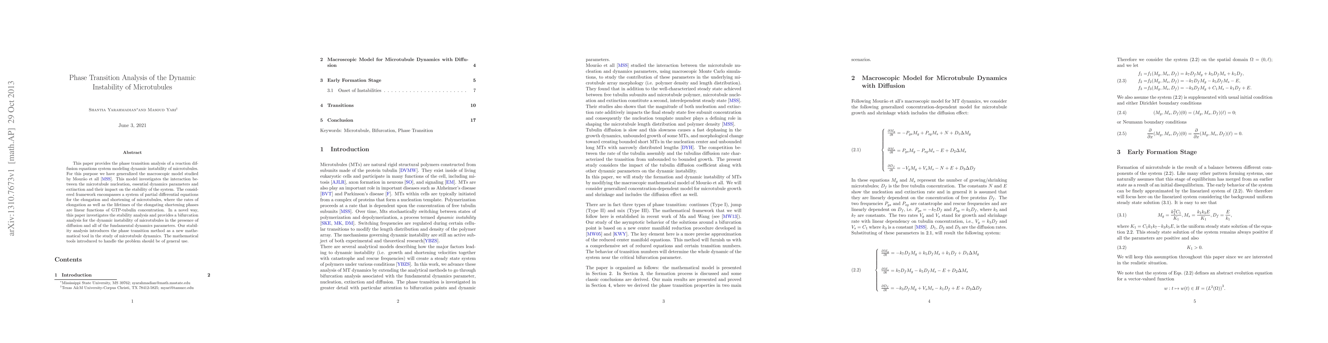 This paper provides the phase transition analysis of a reaction diffusion equations system modeling dynamic instability of microtubules. For this purpose we have generalized the macroscopic model studied by Mour\~ao et all [MSS]. This model investigates the interaction between the microtubule nucleation, essential dynamics parameters and extinction and their impact on the stability of the system. The considered framework encompasses a system of partial differential equations for the elongation and shortening of microtubules, where the rates of elongation as well as the lifetimes of the elongating shortening phases are linear functions of GTP-tubulin concentration. In a novel way, this paper investigates the stability analysis and provides a bifurcation analysis for the dynamic instability of microtubules in the presence of diffusion and all of the fundamental dynamics parameters. Our stability analysis introduces the phase transition method as a new mathematical tool in the study of microtubule dynamics. The mathematical tools introduced to handle the problem should be of general use.
