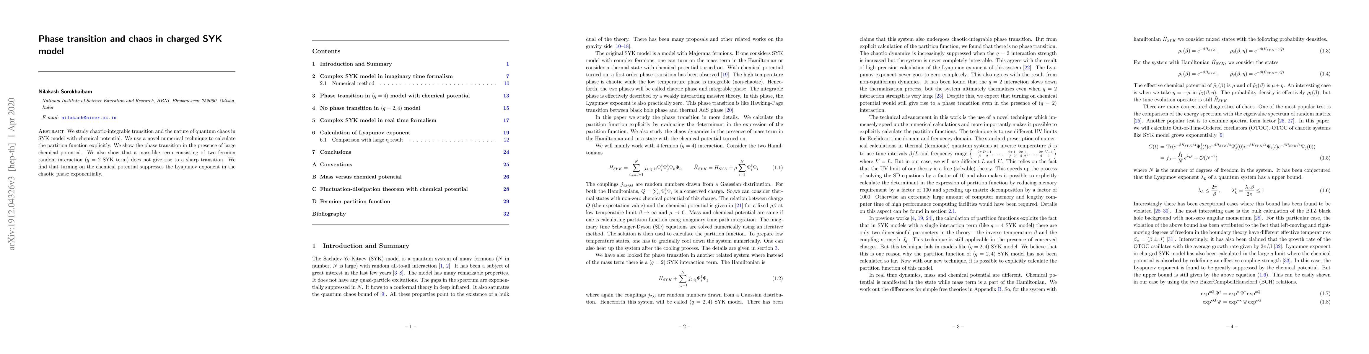 We study chaotic-integrable transition and the nature of quantum chaos in SYK model with chemical potential. We use a novel numerical technique to calculate the partition function explicitly. We show the phase transition in the presence of large chemical potential. We also show that a mass-like term consisting of two fermion random interaction (q=2 SYK term) does not give rise to a sharp transition. We find that turning on the chemical potential suppresses the Lyapunov exponent in the chaotic phase exponentially.
