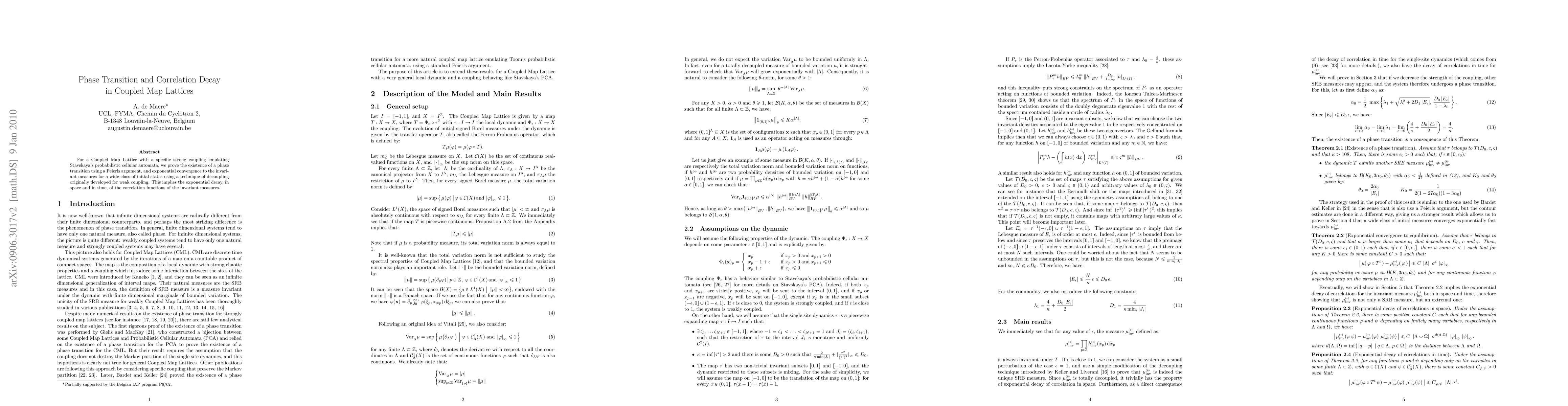 For a Coupled Map Lattice with a specific strong coupling emulating Stavskaya's probabilistic cellular automata, we prove the existence of a phase transition using a Peierls argument, and exponential convergence to the invariant measures for a wide class of initial states using a technique of decoupling originally developed for weak coupling. This implies the exponential decay, in space and in time, of the correlation functions of the invariant measures.
