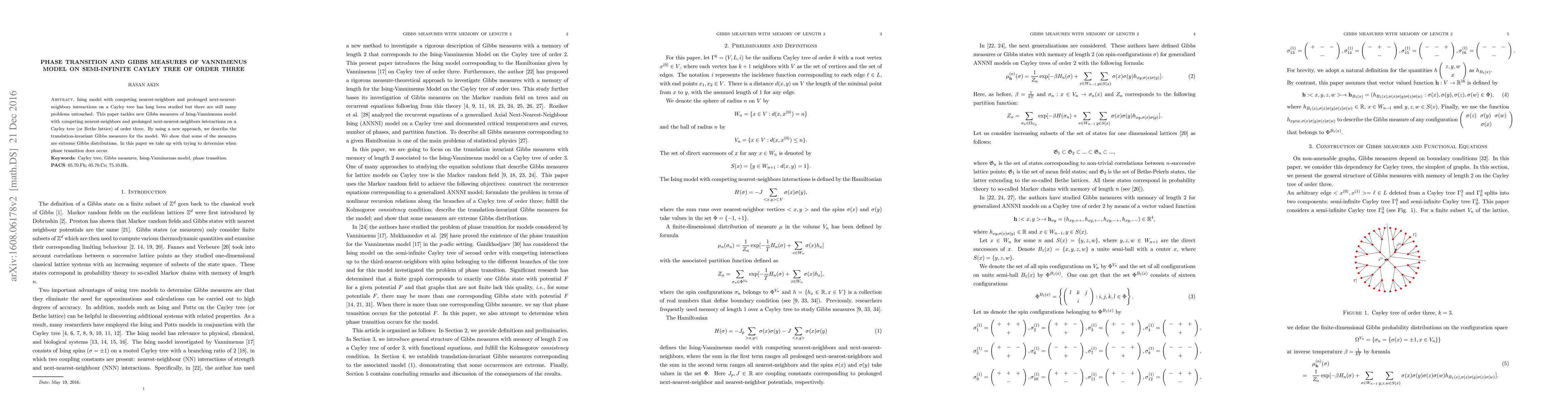 This paper investigates the Gibbs measures of the Vannimenus model on a semi-infinite Cayley tree of order three, focusing on competing interactions. It introduces a new approach to describe translation-invariant Gibbs measures and identifies extreme Gibbs distributions, while also exploring the conditions under which phase transitions occur.
