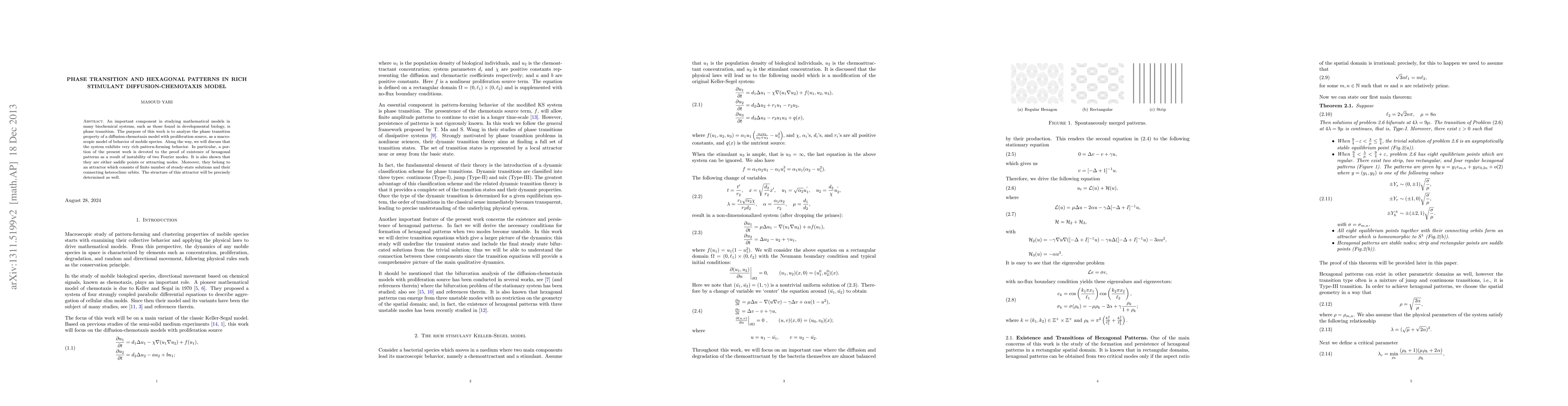 An important component in studying mathematical models in many biochemical systems, such as those found in developmental biology, is phase transition. The purpose of this work is to analyze the phase transition property of a diffusion-chemotaxis model with proliferation source, as a macroscopic model of behavior of mobile species. Along the way, we will discuss that the system exhibits very rich pattern-forming behavior. In particular, a portion of the present work is devoted to the proof of existence of hexagonal patterns as a result of instability of two Fourier modes. It is also shown that they are either saddle points or attracting nodes. Moreover, they belong to an attractor which consists of finite number of steady-state solutions and their connecting heteroclinic orbits. The structure of this attractor will be precisely determined as well.