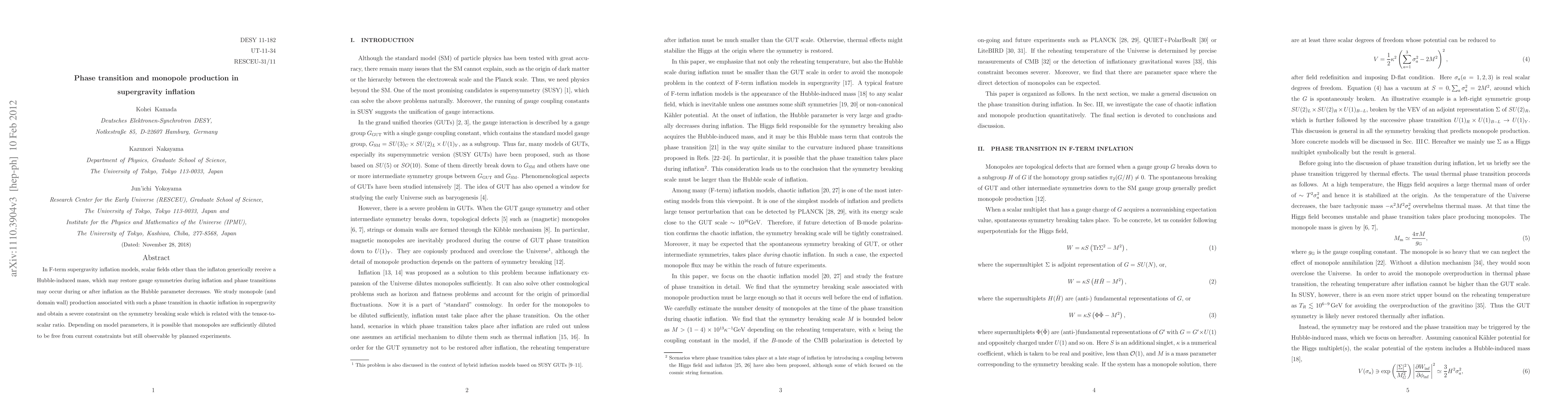 In F-term supergravity inflation models, scalar fields other than the inflaton generically receive a Hubble induced mass, which may restore gauge symmetries during inflation and phase transitions may occur during or after inflation as the Hubble parameter decreases. We study monopole (and domain wall) production associated with such a phase transition in chaotic inflation in supergravity and obtain a severe constraint on the symmetry breaking scale which is related with the tensor-to-scalar ratio. Depending on model parameters, it is possible that monopoles are sufficiently diluted to be free from current constraints but still observable by planned experiments.