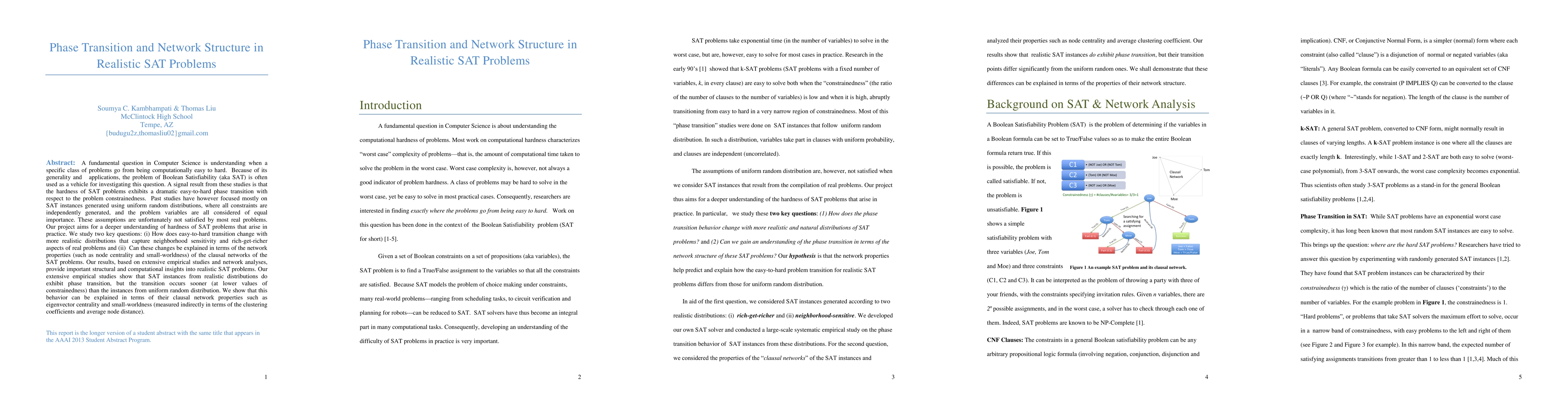 A fundamental question in Computer Science is understanding when a specific class of problems go from being computationally easy to hard. Because of its generality and applications, the problem of Boolean Satisfiability (aka SAT) is often used as a vehicle for investigating this question. A signal result from these studies is that the hardness of SAT problems exhibits a dramatic easy-to-hard phase transition with respect to the problem constrainedness. Past studies have however focused mostly on SAT instances generated using uniform random distributions, where all constraints are independently generated, and the problem variables are all considered of equal importance. These assumptions are unfortunately not satisfied by most real problems. Our project aims for a deeper understanding of hardness of SAT problems that arise in practice. We study two key questions: (i) How does easy-to-hard transition change with more realistic distributions that capture neighborhood sensitivity and rich-get-richer aspects of real problems and (ii) Can these changes be explained in terms of the network properties (such as node centrality and small-worldness) of the clausal networks of the SAT problems. Our results, based on extensive empirical studies and network analyses, provide important structural and computational insights into realistic SAT problems. Our extensive empirical studies show that SAT instances from realistic distributions do exhibit phase transition, but the transition occurs sooner (at lower values of constrainedness) than the instances from uniform random distribution. We show that this behavior can be explained in terms of their clausal network properties such as eigenvector centrality and small-worldness (measured indirectly in terms of the clustering coefficients and average node distance).