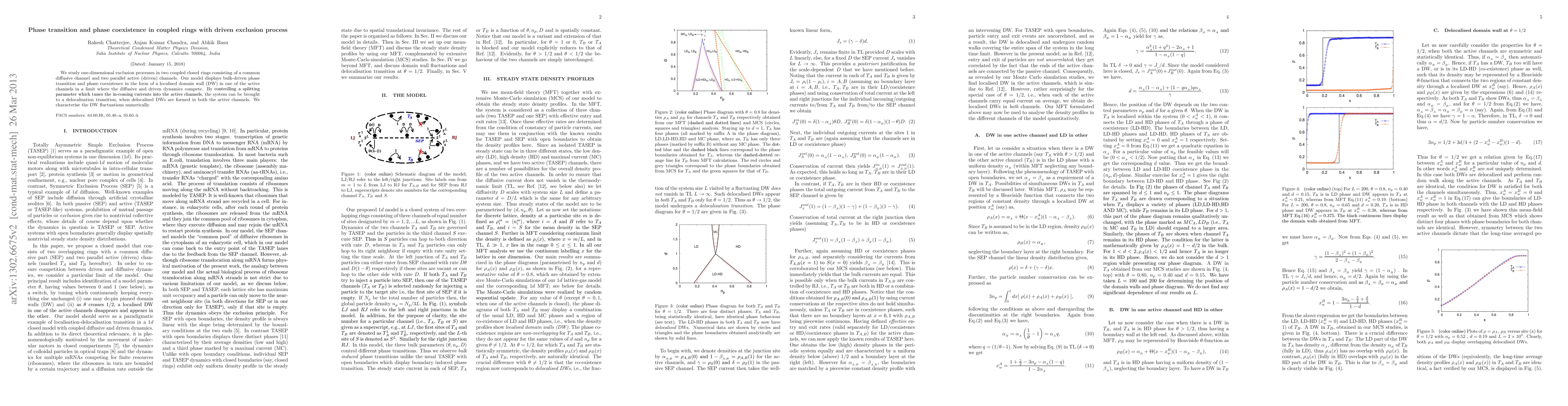 We study one-dimensional exclusion processes in two coupled closed rings consisting of a common diffusive channel and two parallel active (driven) channels. Our model displays bulk-driven phase transition and phase coexistence in the form of a localised domain wall (DW) in one of the active channels in a limit where the diffusive and driven dynamics compete. By controlling a splitting parameter which tunes the in-coming currents into the active channels, the system can be brought to a delocalisation transition, when delocalised DWs are formed in both the active channels. We characterise the DW fluctuations numerically.