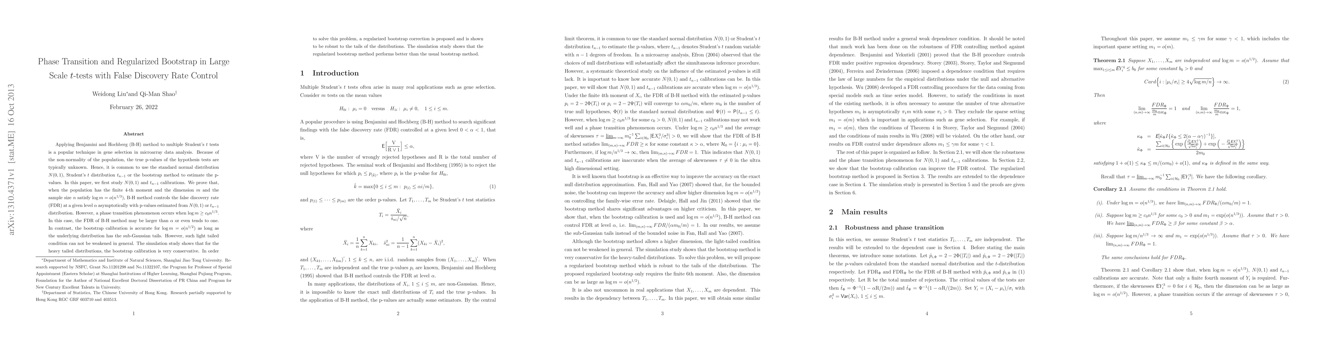 Applying Benjamini and Hochberg (B-H) method to multiple Student's $t$ tests is a popular technique in gene selection in microarray data analysis. Because of the non-normality of the population, the true p-values of the hypothesis tests are typically unknown. Hence, it is common to use the standard normal distribution N(0,1), Student's $t$ distribution $t_{n-1}$ or the bootstrap method to estimate the p-values. In this paper, we first study N(0,1) and $t_{n-1}$ calibrations. We prove that, when the population has the finite 4-th moment and the dimension $m$ and the sample size $n$ satisfy $\log m=o(n^{1/3})$, B-H method controls the false discovery rate (FDR) at a given level $\alpha$ asymptotically with p-values estimated from N(0,1) or $t_{n-1}$ distribution. However, a phase transition phenomenon occurs when $\log m\geq c_{0}n^{1/3}$. In this case, the FDR of B-H method may be larger than $\alpha$ or even tends to one. In contrast, the bootstrap calibration is accurate for $\log m=o(n^{1/2})$ as long as the underlying distribution has the sub-Gaussian tails. However, such light tailed condition can not be weakened in general. The simulation study shows that for the heavy tailed distributions, the bootstrap calibration is very conservative. In order to solve this problem, a regularized bootstrap correction is proposed and is shown to be robust to the tails of the distributions. The simulation study shows that the regularized bootstrap method performs better than the usual bootstrap method.