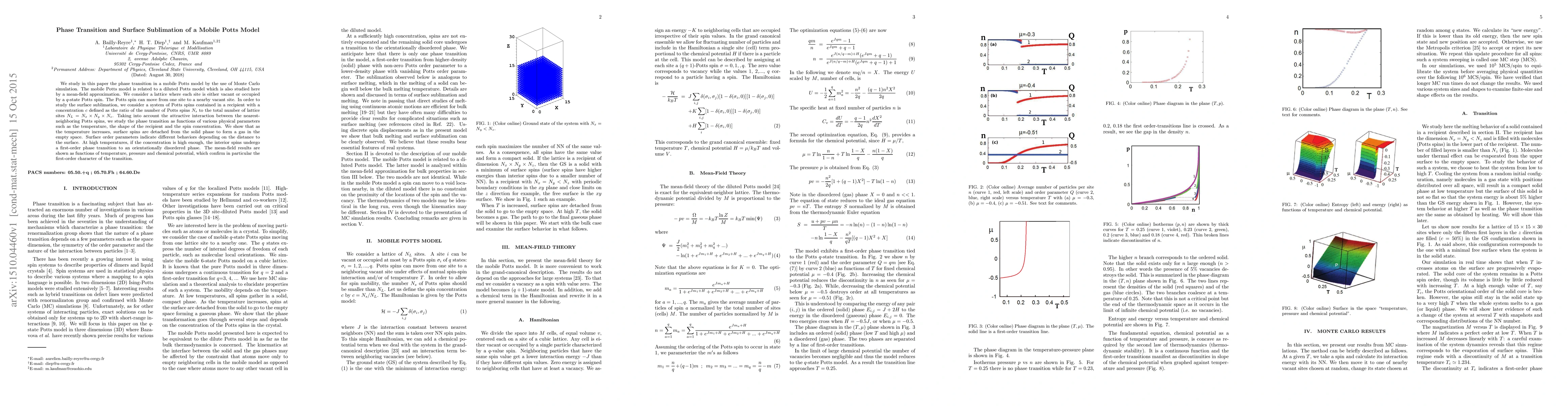 The paper presents a detailed analysis of phase transitions and surface sublimation in a mobile Potts model using both mean-field theory and Monte Carlo simulations, confirming the first-order nature of the phase transition in the bulk.