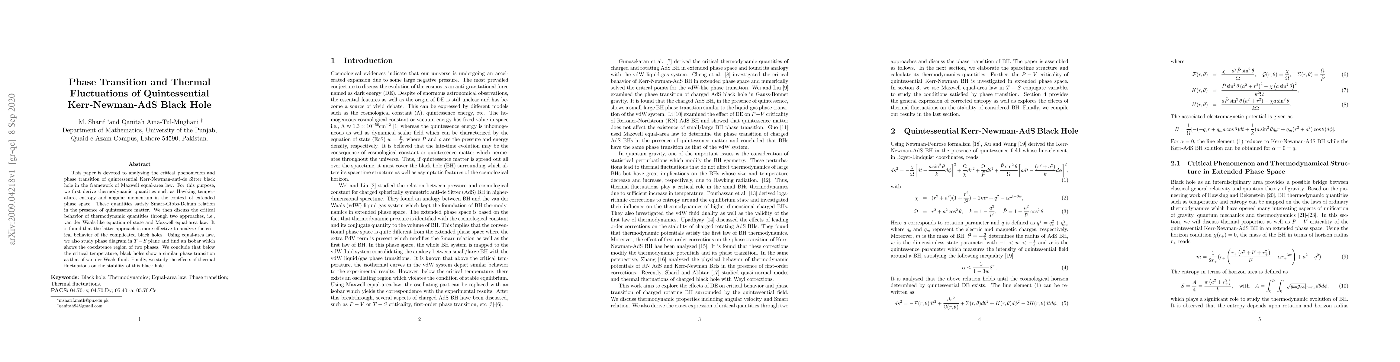 This paper is devoted to analyzing the critical phenomenon and phase transition of quintessential Kerr-Newman-anti-de Sitter black hole in the framework of Maxwell equal-area law. For this purpose, we first derive thermodynamic quantities such as Hawking temperature, entropy and angular momentum in the context of extended phase space. These quantities satisfy Smarr-Gibbs-Dehum relation in the presence of quintessence matter. We then discuss the critical behavior of thermodynamic quantities through two approaches, i.e., van der Waals-like equation of state and Maxwell equal-area law. It is found that the latter approach is more effective to analyze the critical behavior of the complicated black holes. Using equal-area law, we also study phase diagram in $T-S$ plane and find an isobar which shows the coexistence region of two phases. We conclude that below the critical temperature, black holes show a similar phase transition as that of van der Waals fluid. Finally, we study the effects of thermal fluctuations on the stability of this black hole.