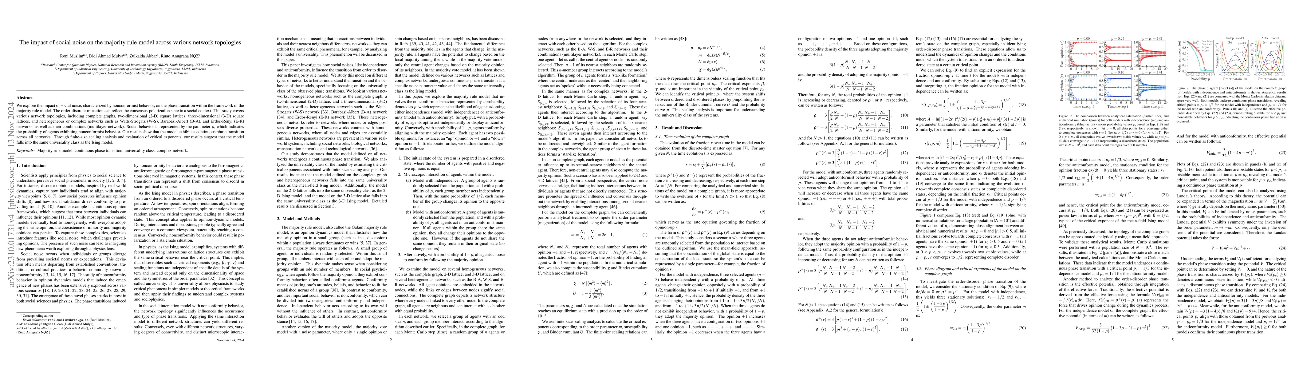 This paper explores the impact of social noise, characterized by either independence or anticonformity, on order-disorder phase transitions within the majority-rule model framework. The study spans diverse network topologies, including the complete graph, two-dimensional (2-D) square lattice, three-dimensional (3-D) square lattice, and heterogeneous networks such as Watts-Strogatz, Barab\'asi-Albert, and Erd\H{o}s-Renyi networks. The social noise is represented by the fundamental parameter $p$, denoting the likelihood of agents displaying independent or anticonformist tendencies. The nature of the phase transitions observed depends on both the probability parameter $p$ and the network topologies. Specifically, the models show continuous phase transitions on the complete graph and the 2-D square lattice, with critical points subject to parameter variations. However, in the 3-D lattice, models featuring independence noise notably lack a distinct phase transition, whereas those with anticonformity noise still exhibit continuous phase transitions. Through finite-size scaling analysis and critical exponents evaluation, we confirm that all models align with the Ising model universality class, except in the 3-D model.