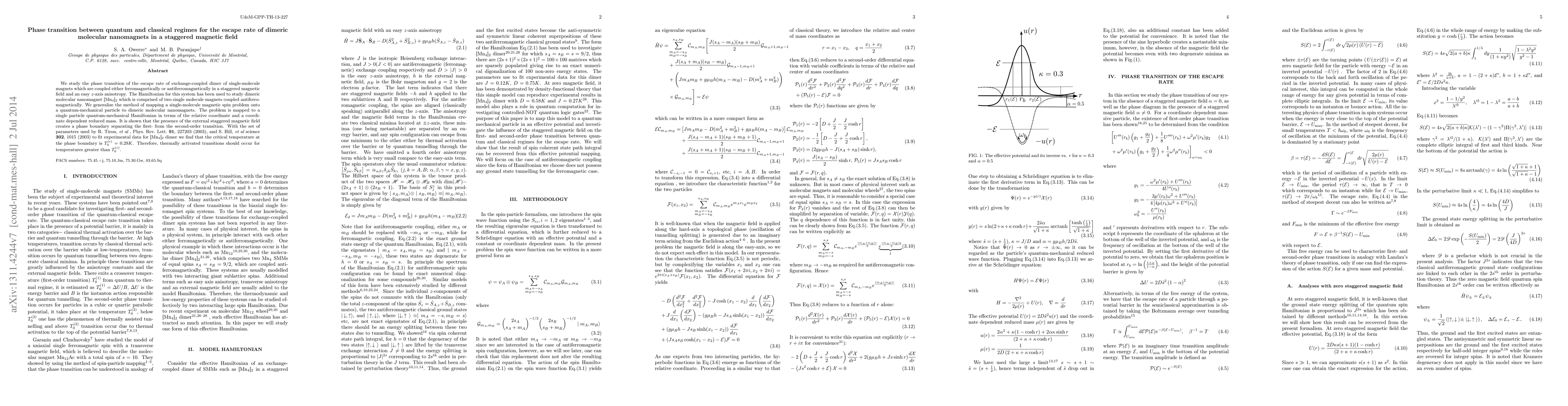 This paper investigates the phase transition in the escape rate of dimeric molecular nanomagnets, specifically [Mn$_4$]$_2$ dimers, under a staggered magnetic field and $z$-axis anisotropy. The study reveals a phase boundary created by the external field, distinguishing first- and second-order transitions, with a critical temperature of $T^{(c)}_0 = 0.29K$ for thermally activated transitions.