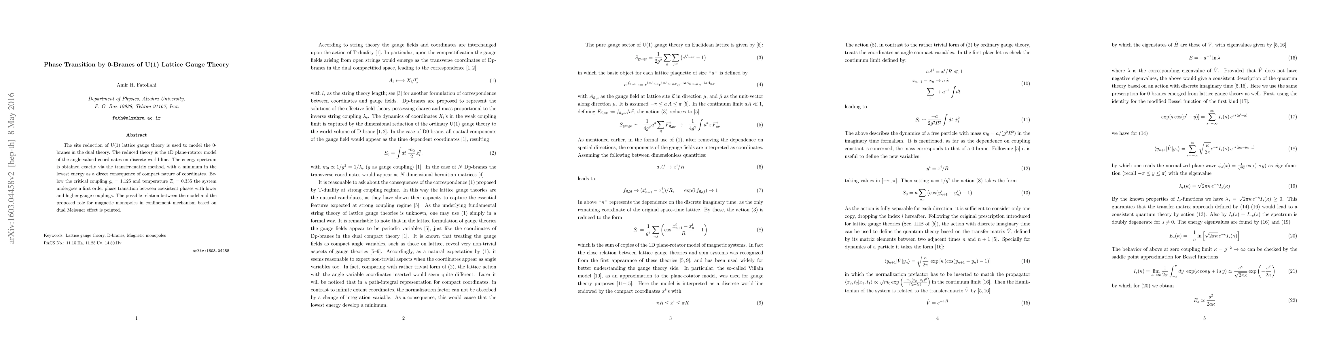 This paper investigates the phase transition in U(1) lattice gauge theory by modeling 0-branes using site reduction, revealing a first-order phase transition below critical coupling $g_c=1.125$ and temperature $T_c=0.335$. The study suggests a connection between this model and the role of magnetic monopoles in the confinement mechanism.